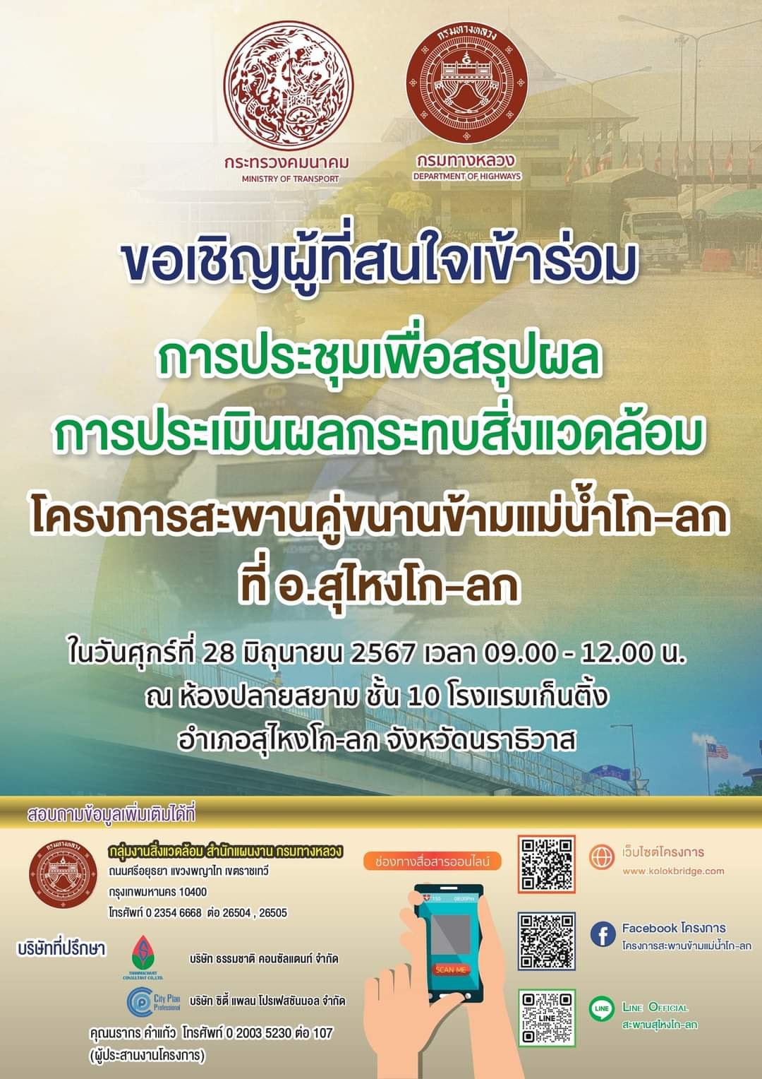 ขอเชิญผู้สนใจเข้าร่วมการประชุมเพื่อสรุปผลการประเมินผลกระทบสิ่งแวดล้อม โครงการสะพานคู่ขนานข้ามแม่น้ำโก-ลก ที่ อ.สุไหงโก-ลก