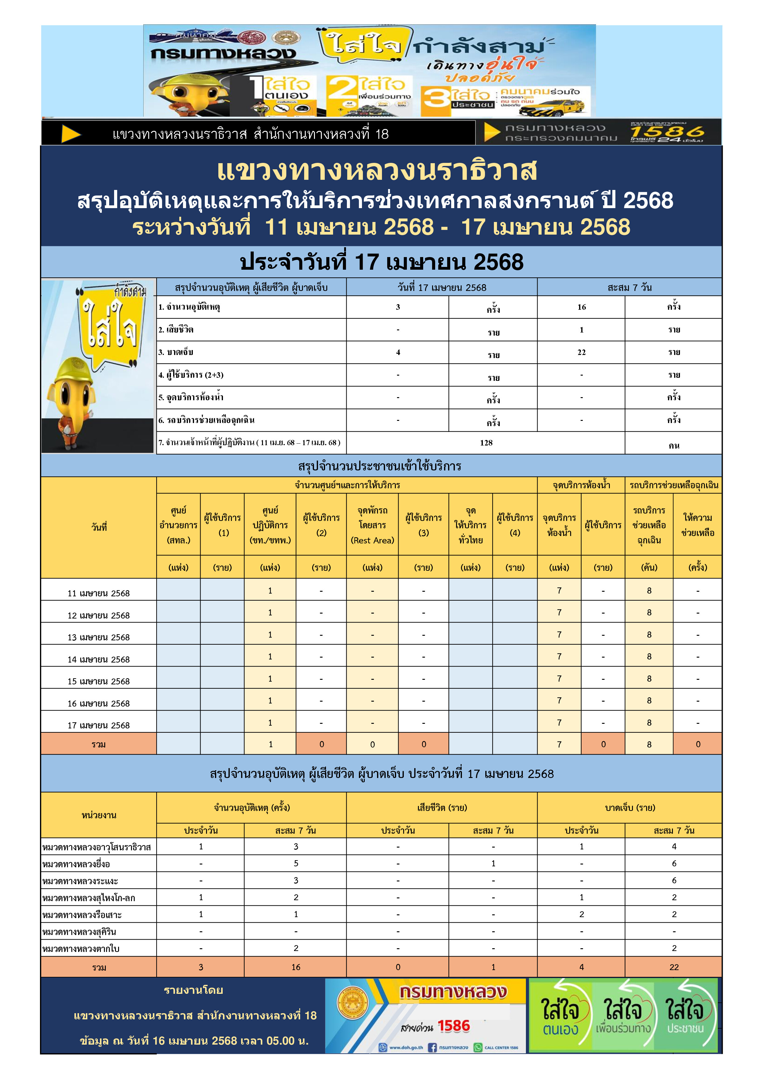 สรุปรายงานอุบัติเหตุและการให้บริการช่วงเทศกาลสงกรานต์ ปี 2568 ประจำวันที่ 17 เมษายน 2568