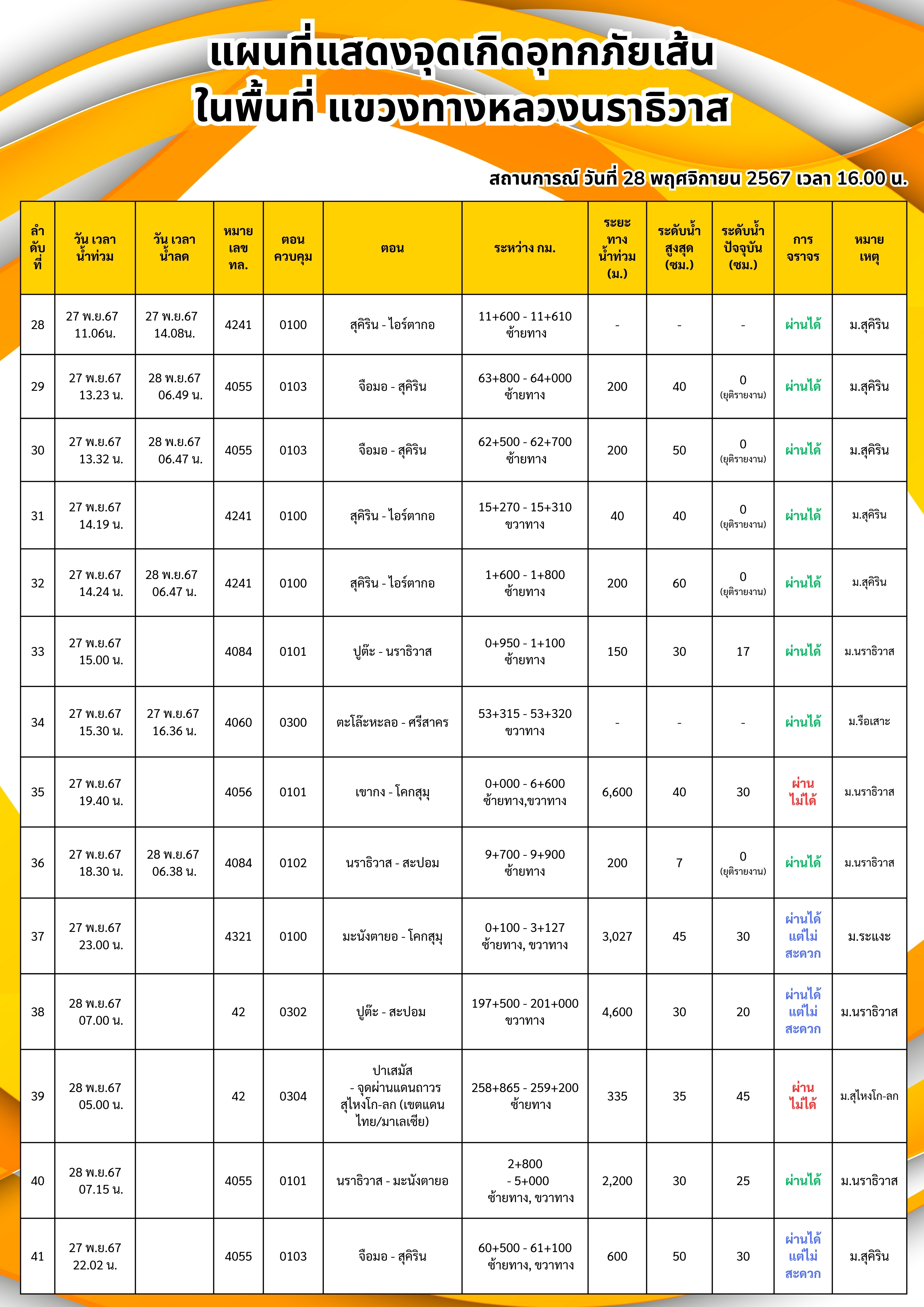 รายงานสถานการณ์อุทกภัยในพื้นที่จังหวัดนราธิวาส วันเวลาที่ update วันที่ 28 พ.ย. 67 เวลา 16.00 น.