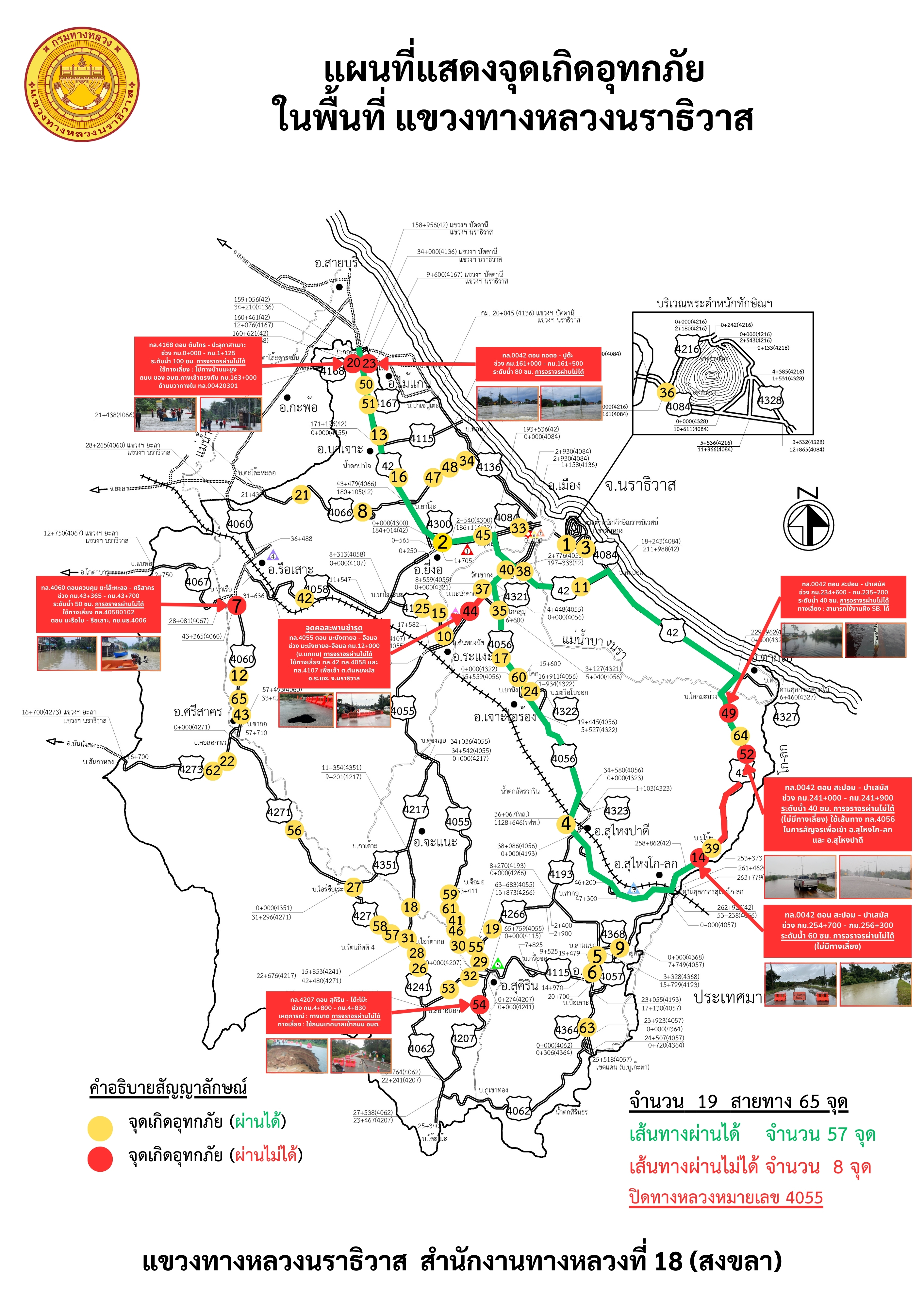 รายงานสถานการณ์อุทกภัยเส้นทางหลัก ได้แก่ ทล.42 และ ทล.4056 ในพื้นที่จังหวัดนราธิวาส วันเวลาที่ update วันที่ 27 พ.ย. 67 เวลา 20.30 น.