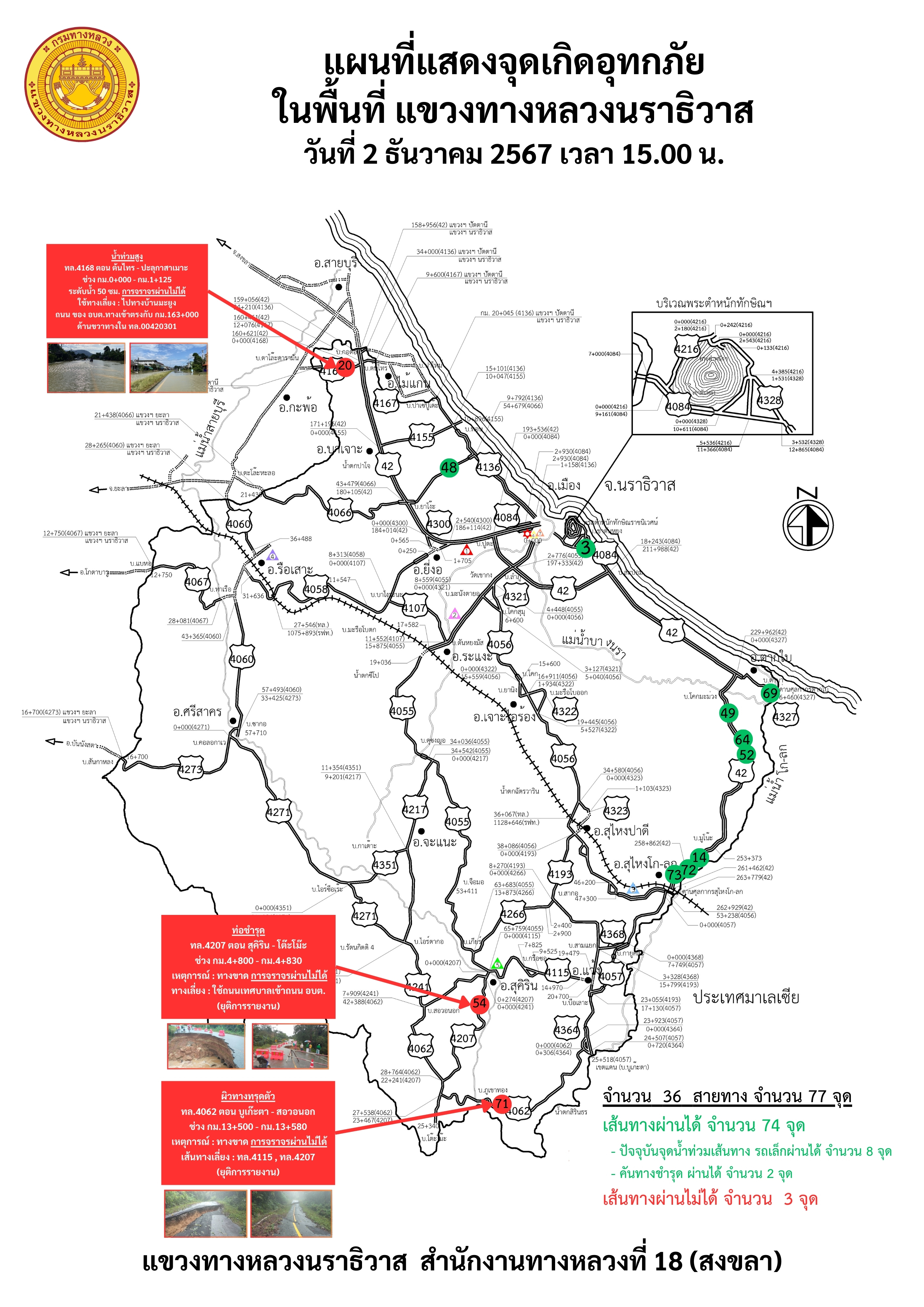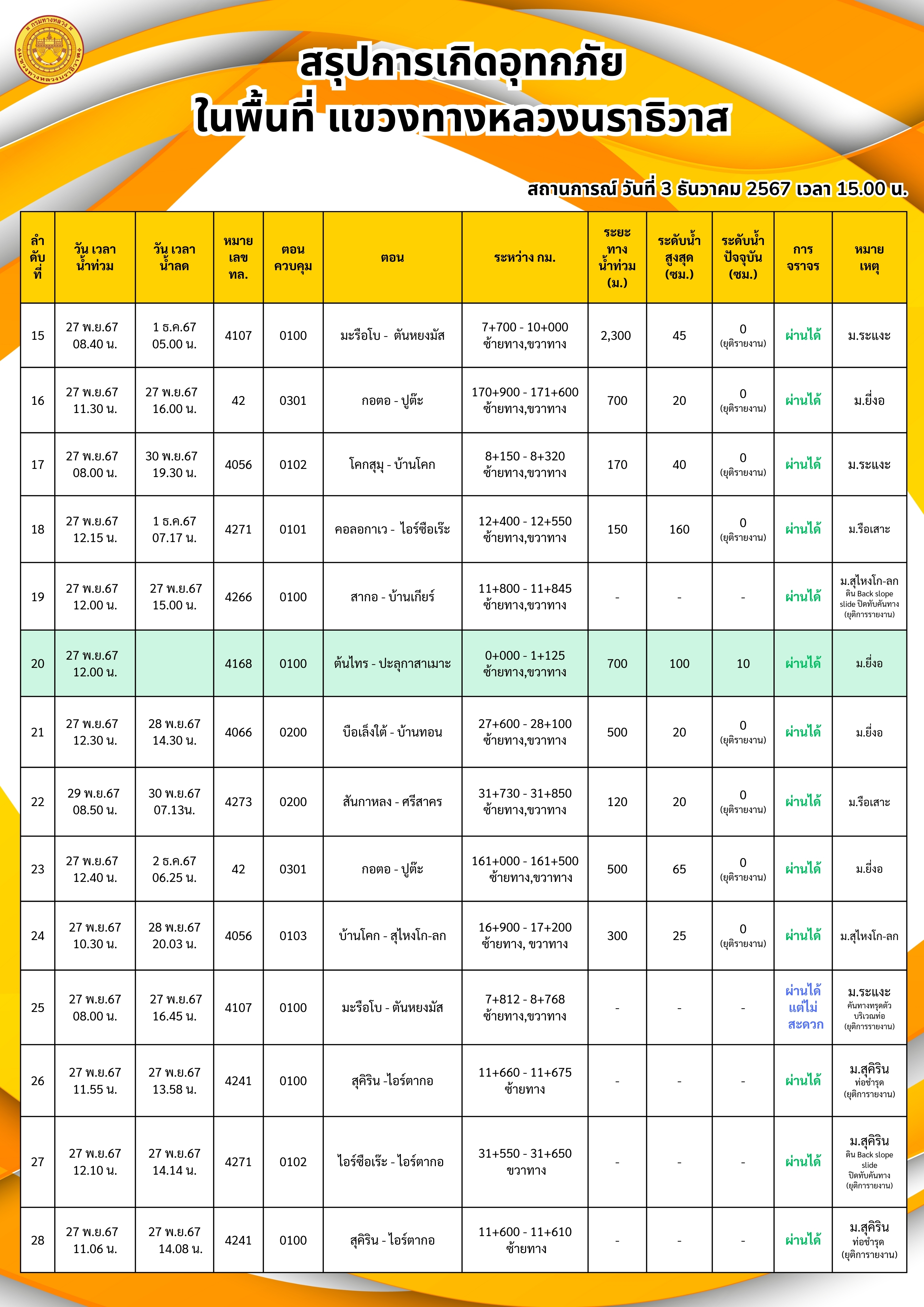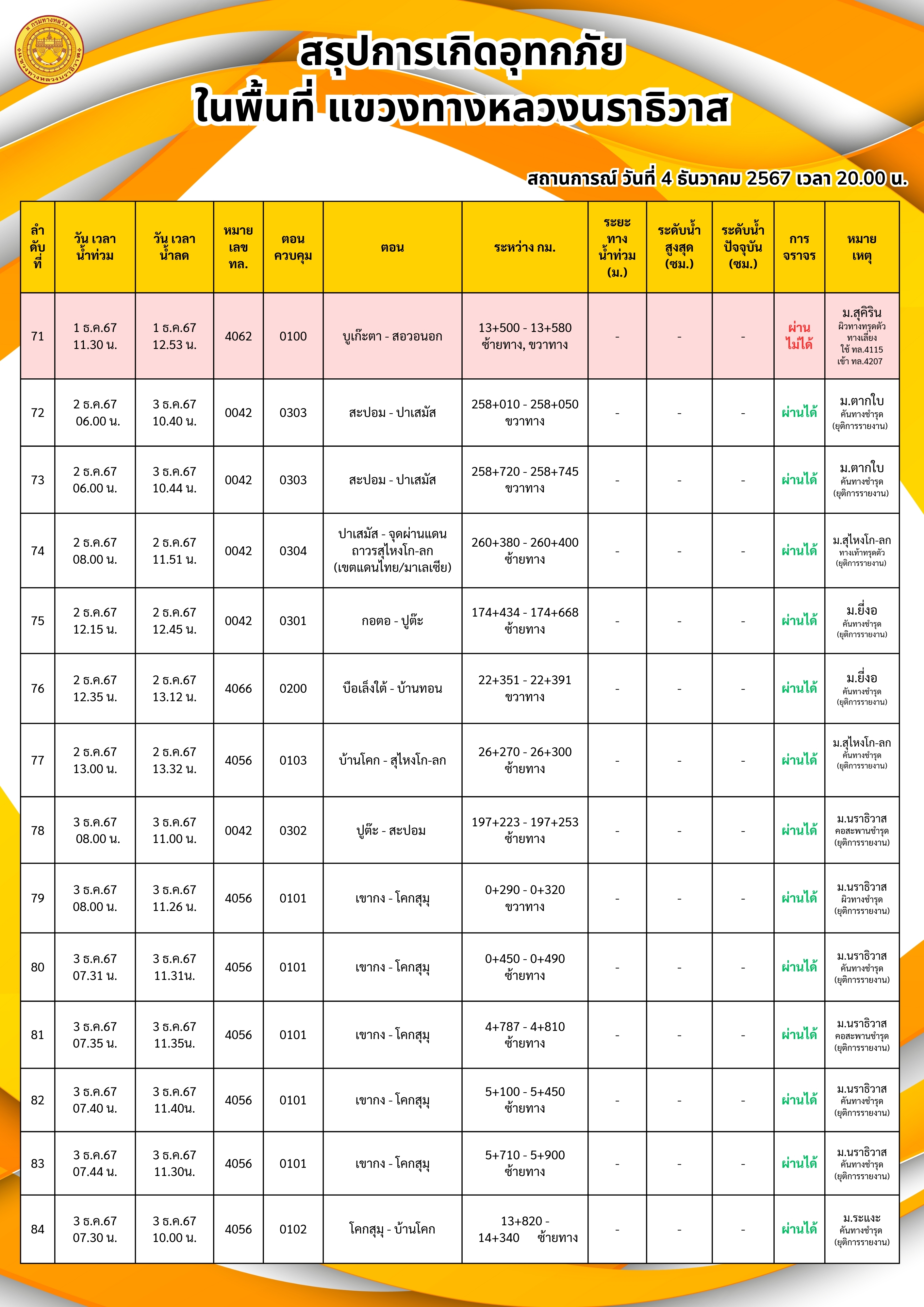 แขวงทางหลวงนราธิวาส ขอรายงานสถานการณ์อุทกภัยในพื้นที่จังหวัดนราธิวาส วันเวลาที่ update วันที่ 4 ธ.ค. 67 เวลา 20.00 น.