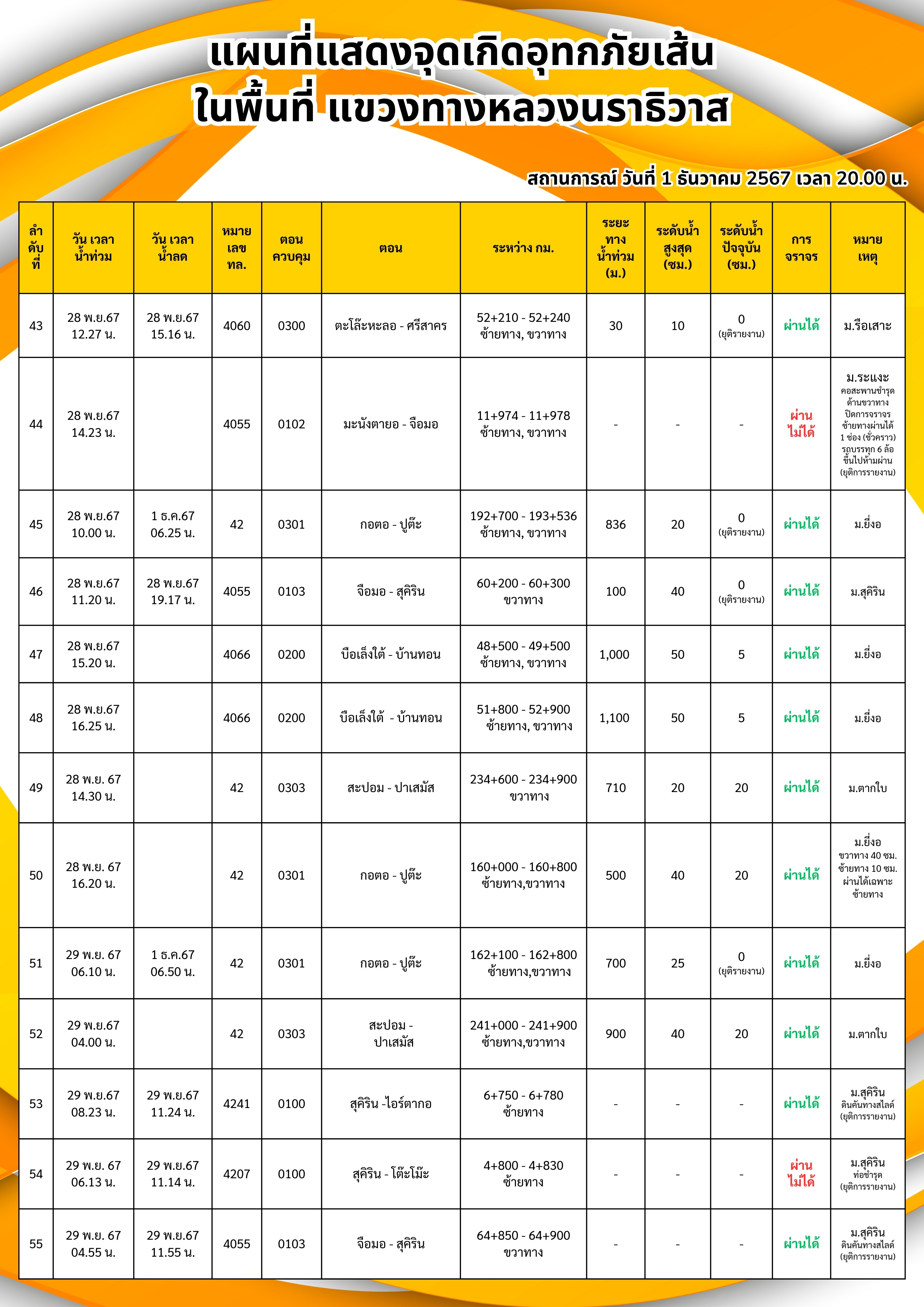 แขวงทางหลวงนราธิวาส ขอรายงานสถานการณ์อุทกภัยในพื้นที่จังหวัดนราธิวาส วันเวลาที่ update วันที่ 5 ธ.ค. 67 เวลา 20.00 น.