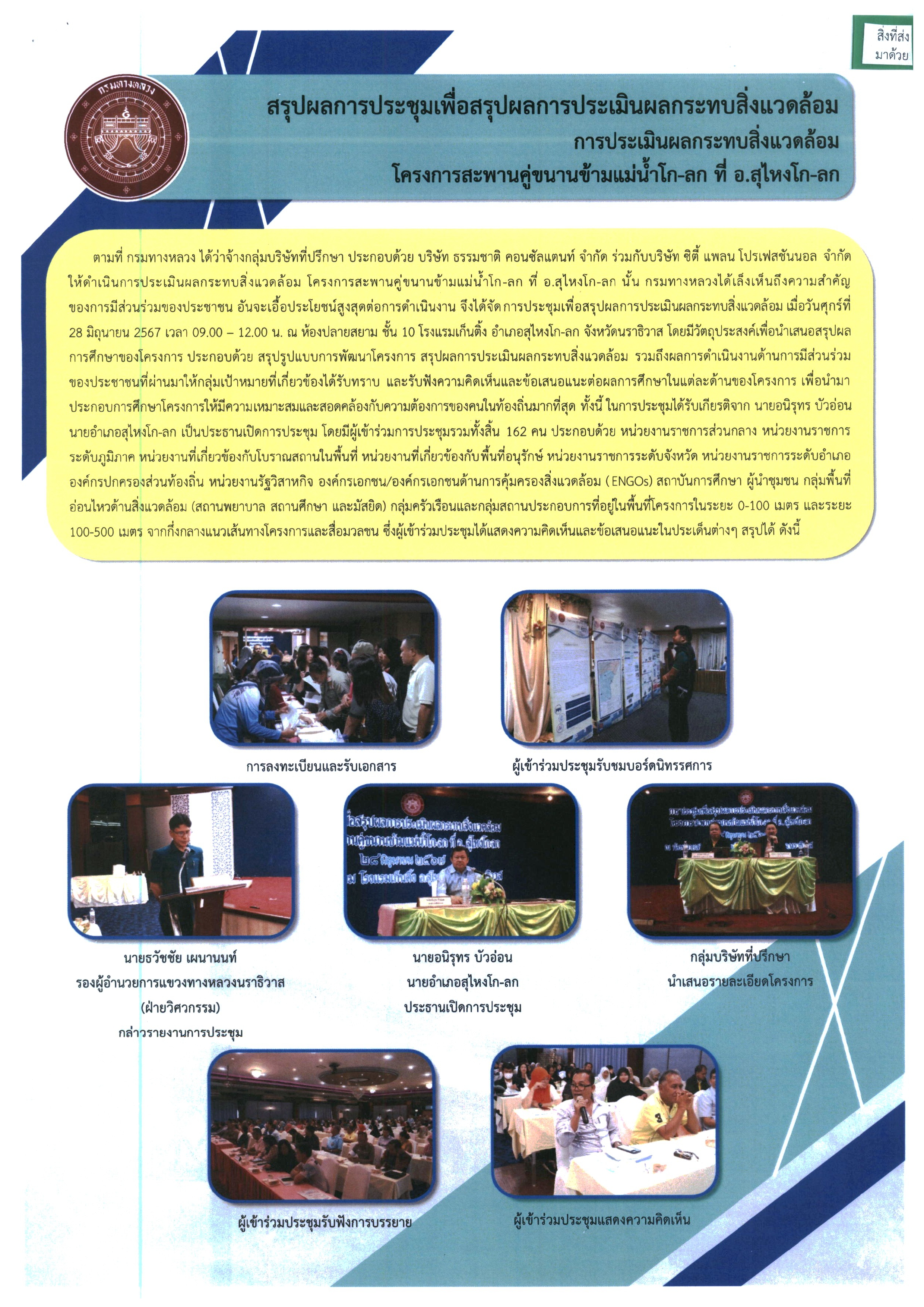 ร่วมประชุมเพื่อสรุปผลการประเมินผลกระทบสิ่งแวดล้อม โครงการสะพานคู่ขนานข้ามแม่น้ำโก-ลก ที่ อ.สุไหงโก-ลก