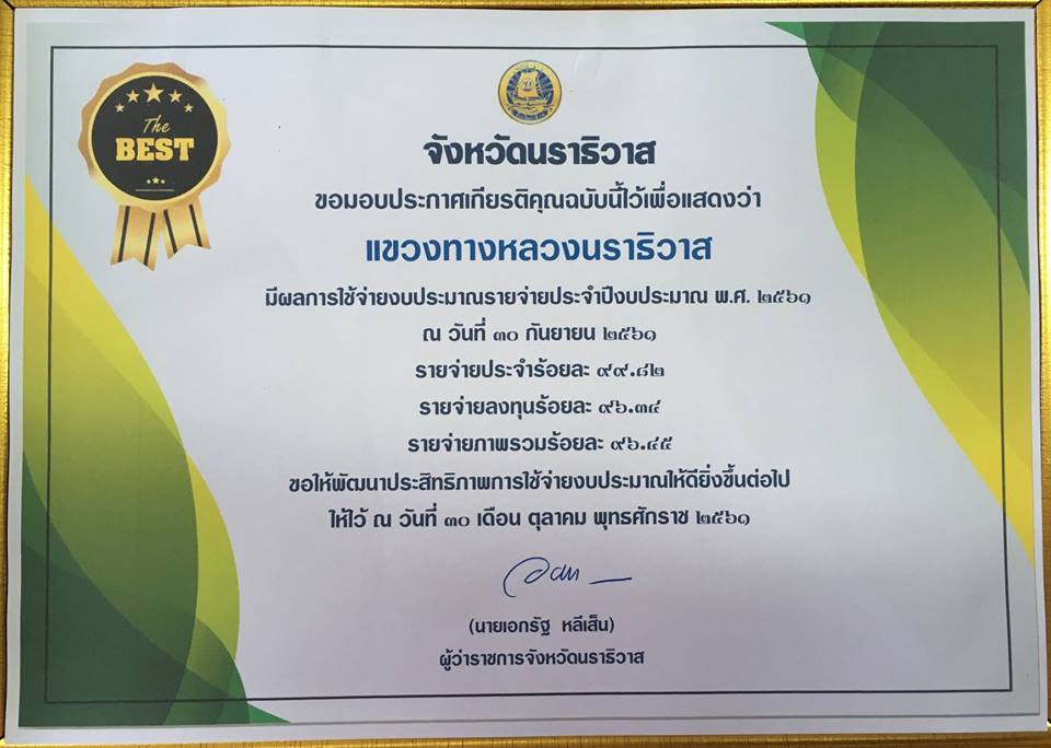 นายวัลลภ จินดาเพ็ชร รองผู้อำนวยการแขวงทางหลวงนราธิวาส ฝ่ายวิศวกรรม รักษาราชการแทน ผอ.ขท.นราธิวาส เป็นตัวแทนรับมอบโล่ประกาศเกียรติคุณ หน่วยงานที่มีประสิทธิภาพในการใช้จ่ายงบประมาณรายจ่ายประจำปีงบประมาณ 2561 เป็นอันดับที่ 2 โดยนายเอกรัฐ หลีเส็น ผู้ว่าราชการจังหวัดนราธิวาส เป็นผู้มอบ