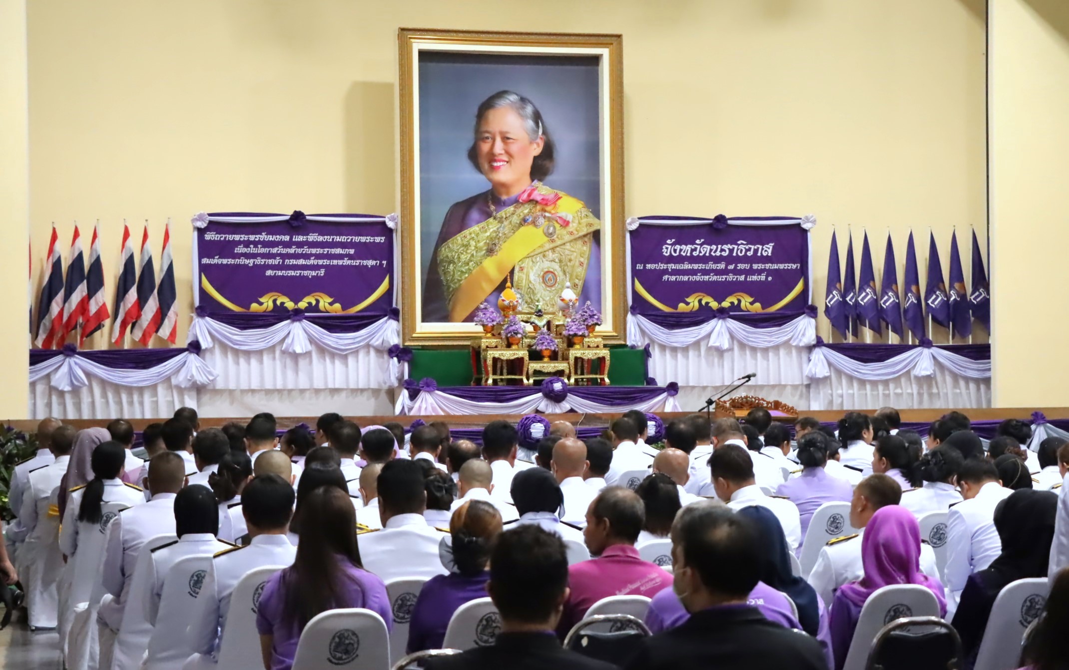 นายจอมปวีร์ จันทร์หิรัญ ผู้อำนวยการสำนักงานทางหลวงที่ 18 รักษาราชการแทน ผู้อำนวยการแขวงทางหลวงนราธิวาส มอบหมายให้นางอรัญญา เพ็ชรพูล รองผู้อำนวยการแขวงทางหลวงนราธิวาส (ฝ่ายบริหาร) ร่วมพิธีเนื่องในโอกาสวันคล้ายวันพระราชสมภพ สมเด็จพระกนิษฐาธิราชเจ้า กรมสมเด็จพระเทพรัตนราชสุดาฯ สยามบรมราชกุมารี และร่วมพิธีลงนามถวายพระพร ณ หอประชุมเฉลิมพระเกียรติ 7 รอบ พระชนมพรรษา ศาลากลางจังหวัดนราธิวาส (แห่งที่ 1) ต.ลำภู อ.เมืองนราธิวาส จ.นราธิวาสโดยมีว่าที่ร้อยตรี ตระกูล โทธรรม ผู้ว่าราชการจังหวัดนราธิวาส เป็นประธานในพิธี พร้อมด้วยส่วนราชการเข้าร่วมพิธีดังกล่าว
