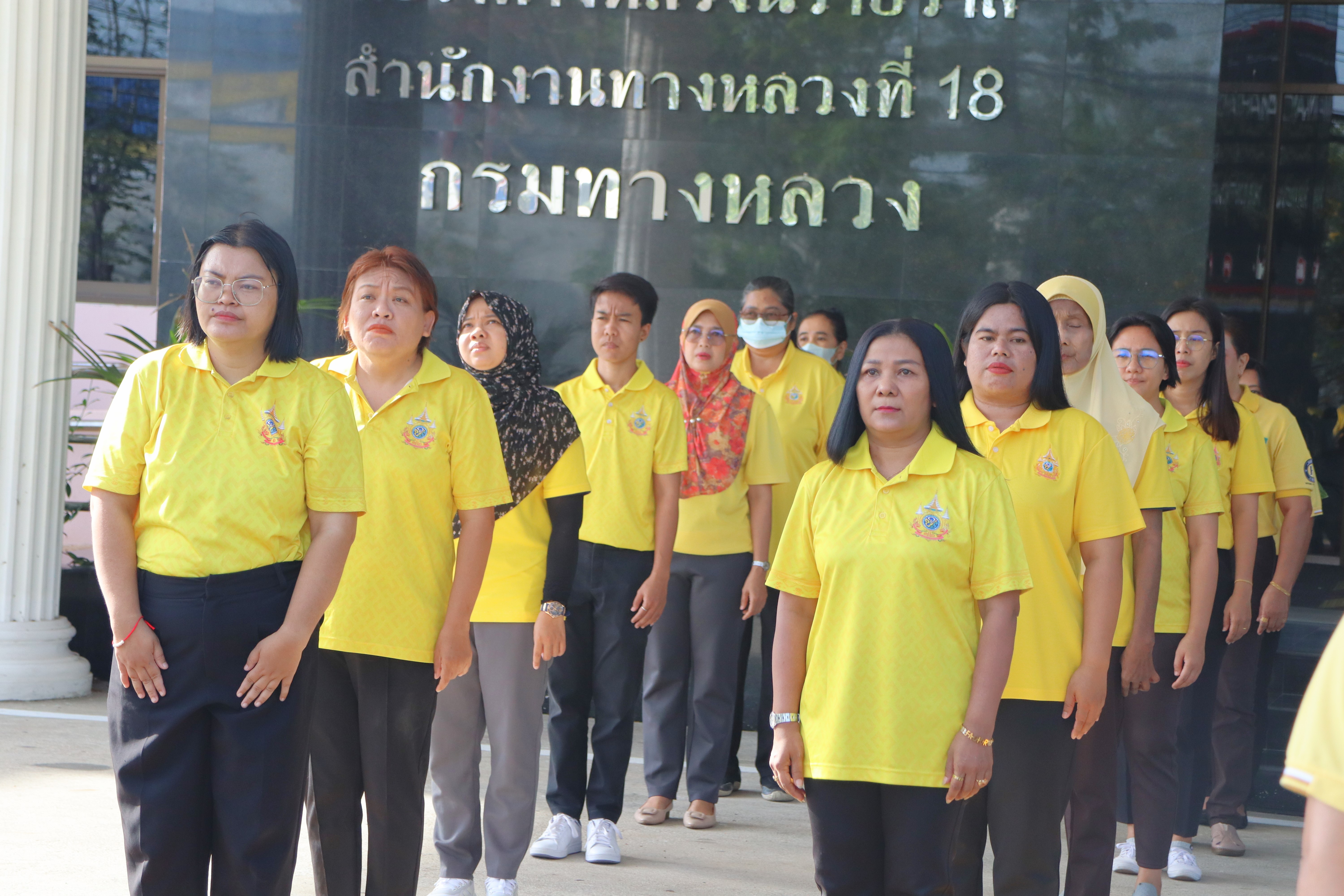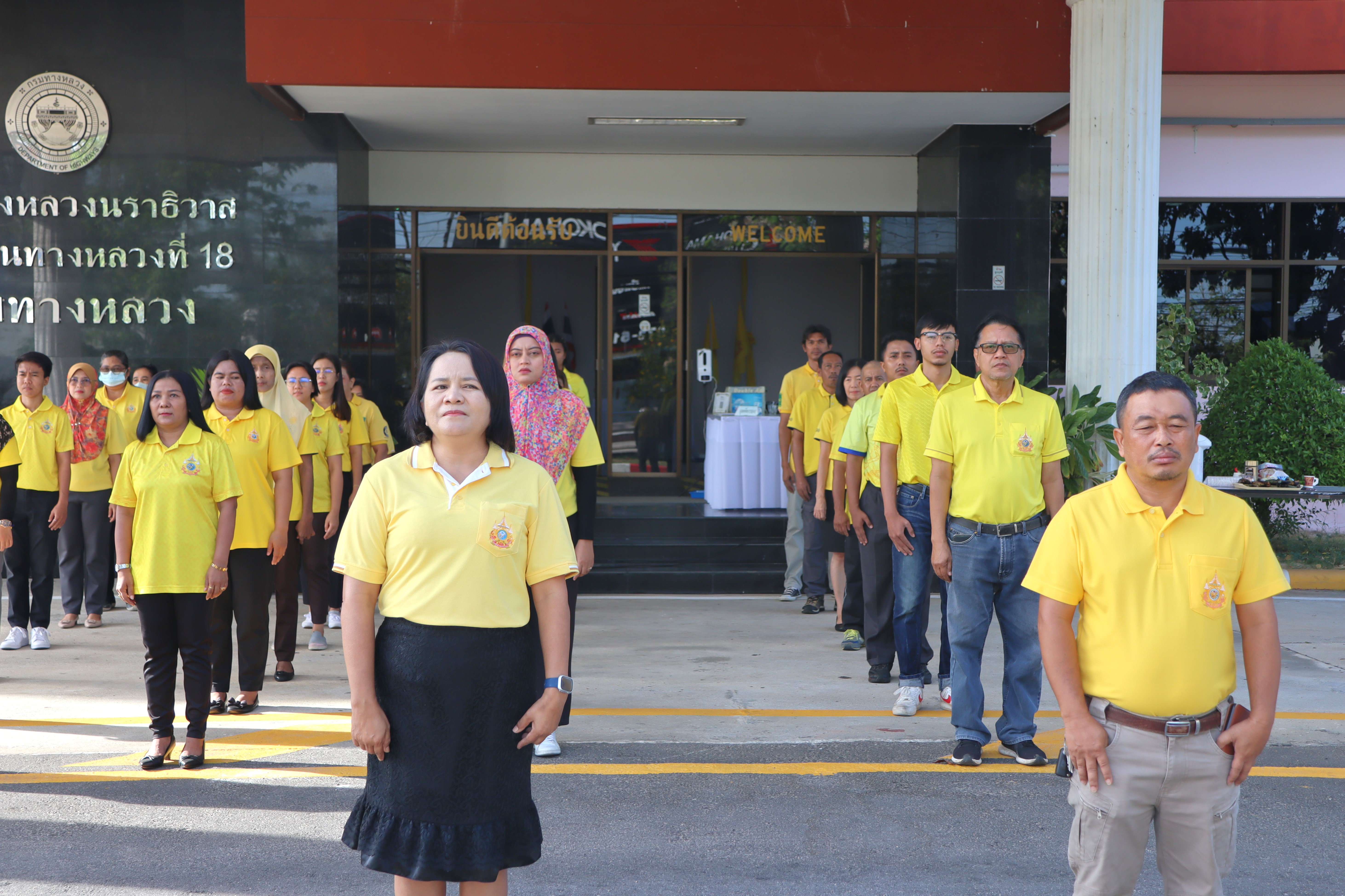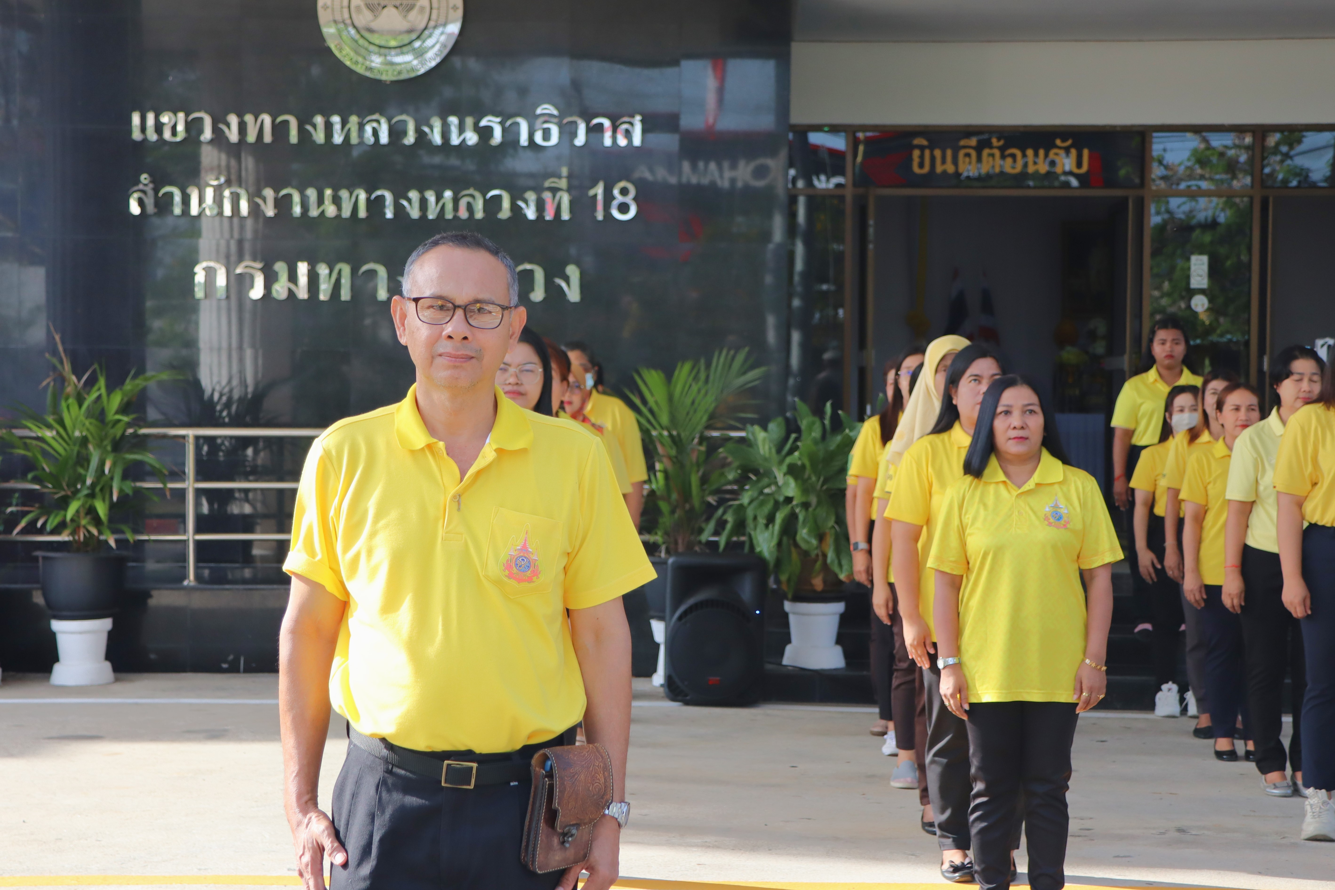 นายปฏิเวชวุฒิศักย์ สุขขี ผู้อำนวยการแขวงทางหลวงนราธิวาส มอบหมายให้รองผู้อำนวยการแขวงทางหลวงนราธิวาส ฝ่ายปฏิบัติการ ฝ่ายบริหาร ผู้อำนวยการหมวดทางหลวงอาวุโสนราธิวาส นำข้าราชการ และเจ้าหน้าที่แขวงทางหลวงนราธิวาส ร่วมกิจกรรมเข้าแถวเคารพธงชาติ โดยร่วมแต่งกายด้วยเสื้อสีเหลืองเพื่อเฉลิมพระเกียรติพระบาทสมเด็จพระเจ้าอยู่หัว เนื่องในโอกาสมหามงคลเฉลิมพระชนมพรรษา 6 รอบ 28 กรกฏาคม 2567 และเพื่อเสริมสร้างจิตสำนึกต่อสถาบันชาติ ศาสนา พระมหากษัตริย์ และการเป็นข้าราชการที่ดี เพื่อแสดงออกถึงความจงรักภักดีต่อชาติ ศาสนา พระมหากษัตริย์ และเป็นการเตรียมความพร้อมในการปฏิบัติราชการอีกทั้งยังเป็นการเพิ่มประสิทธิภาพในการทำงานเสริมสร้างความรัก ความสามัคคีในองค์กร
