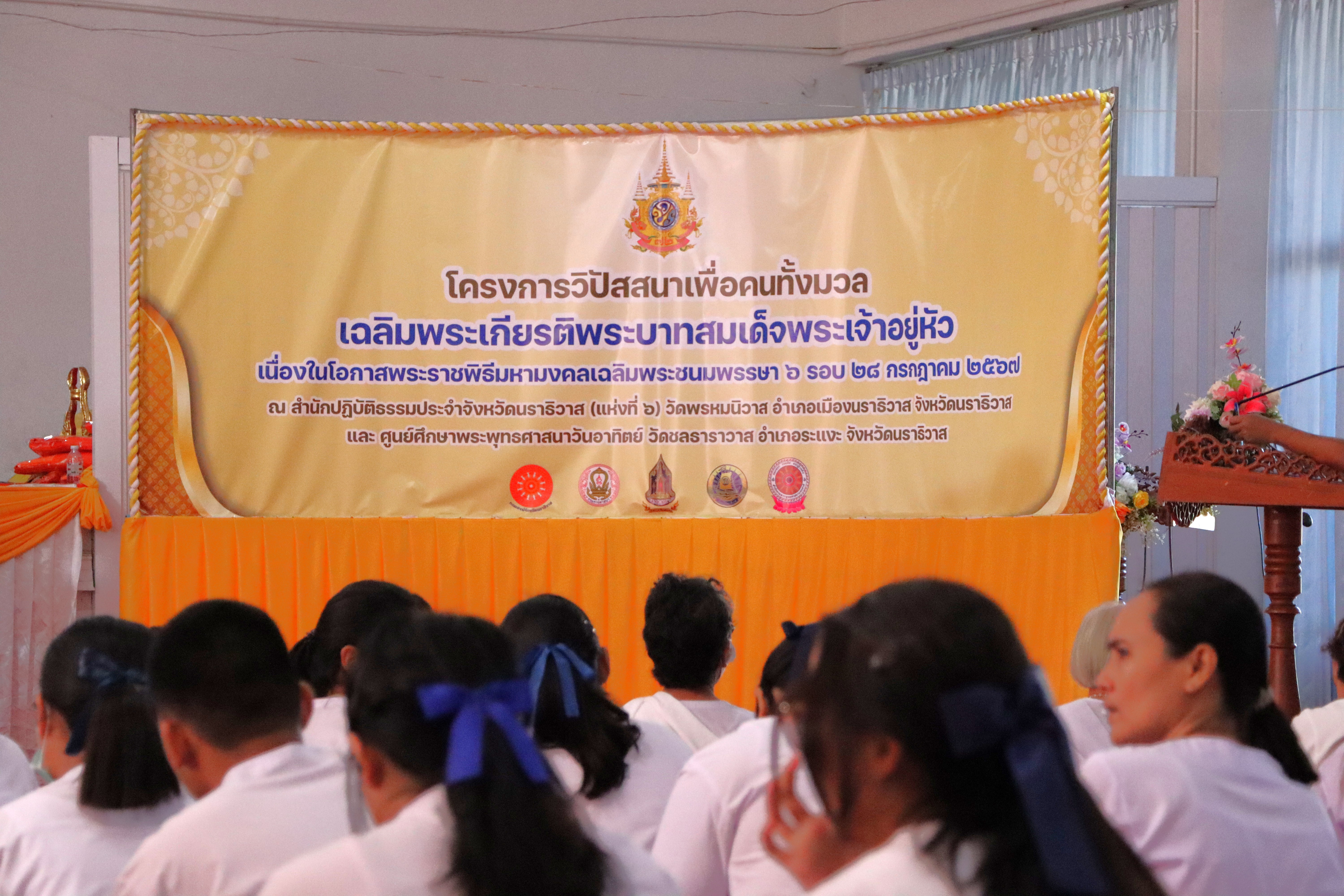 นายปฏิเวชวุฒิศักย์ สุขขี ผู้อำนวยการแขวงทางหลวงนราธิวาส มอบหมายให้เจ้าหน้าที่ฝ่ายบริหาร ร่วมโครงการวิปัสสนาเพื่อคนทั้งมวล เฉลิมพระเกียรติพระบาทสมเด็จพระเจ้าอยู่หัว เนื่องในโอกาสพระราชพิธีมหามงคลเฉลิมพระชนมพรรษา 6 รอบ 28 กรกฎาคม 2567 ณ สำนักปฏิบัติธรรมประจำจังหวัดนราธิวาส (แห่งที่ 6) วัดพรหมนิวาส อ.เมืองนราธิวาส จ.นราธิวาส โดยมีนายฉัตรชัย อุสาหะ รองผู้ว่าราชการจังหวัดนราธิวาาส เป็นประธานในพิธี พร้อมด้วยส่วนราชการ รัฐวิสาหกิจ ประชาชน ร่วมพิธีดังกล่าว