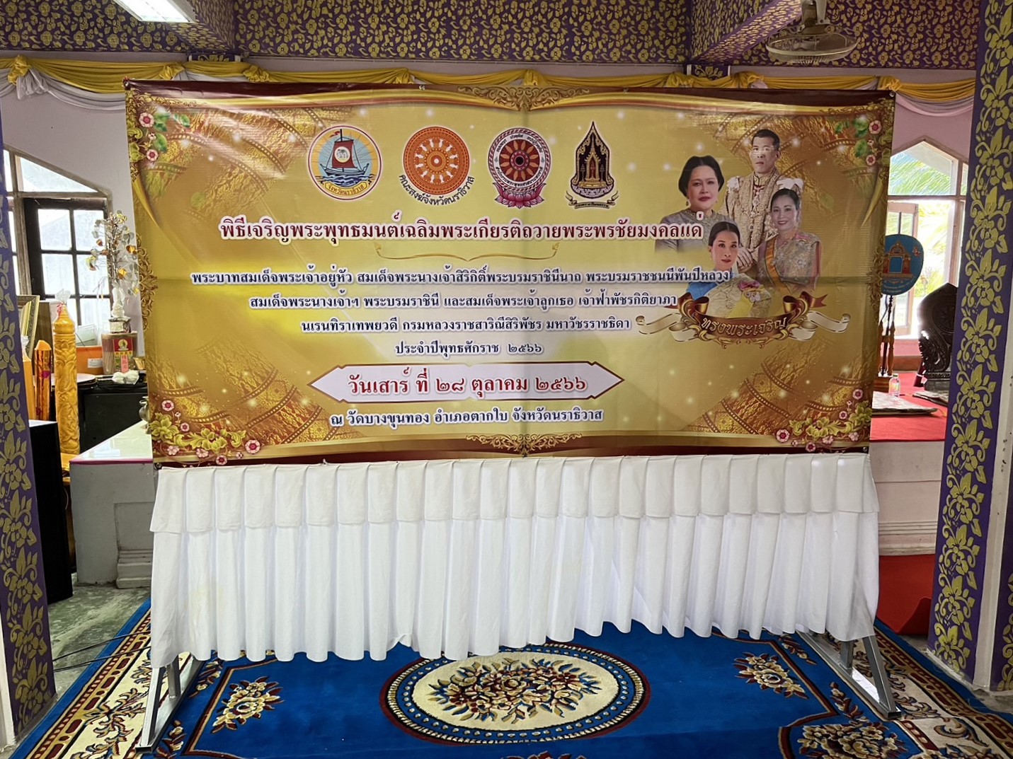 นายสมัคร เลือดวงหัด ผู้อำนวยการแขวงทางหลวงนราธิวาส มอบหมายให้ หมวดทางหลวงตากใบ เข้าร่วมพิธีเจริญพระพุทธมนต์เฉลิมพระเกียรติถวายพระพรชัยมงคลแด่พระบาทสมเด็จพระเจ้าอยู่หัว สมเด็จพระนางเจ้าสิริกิติ์ พระบรมราชินีนาถ พระบรมราชชนนีพันปีหลวง สมเด็จพระนางเจ้าฯ พระบรมราชินี และสมเด็จพระเจ้าลูกเธอเจ้าฟ้าพัชรกิติยาภา นเรนทิราเทพยวดี กรมหลวงราชสาริณีสิริพัชร มหาวัชรราชธิดา ประปีงบปีพุทธศักราช 2566 ณ วัดบางขุนทอง อำเภอตากใบ จังหวัดนราธิวาส
