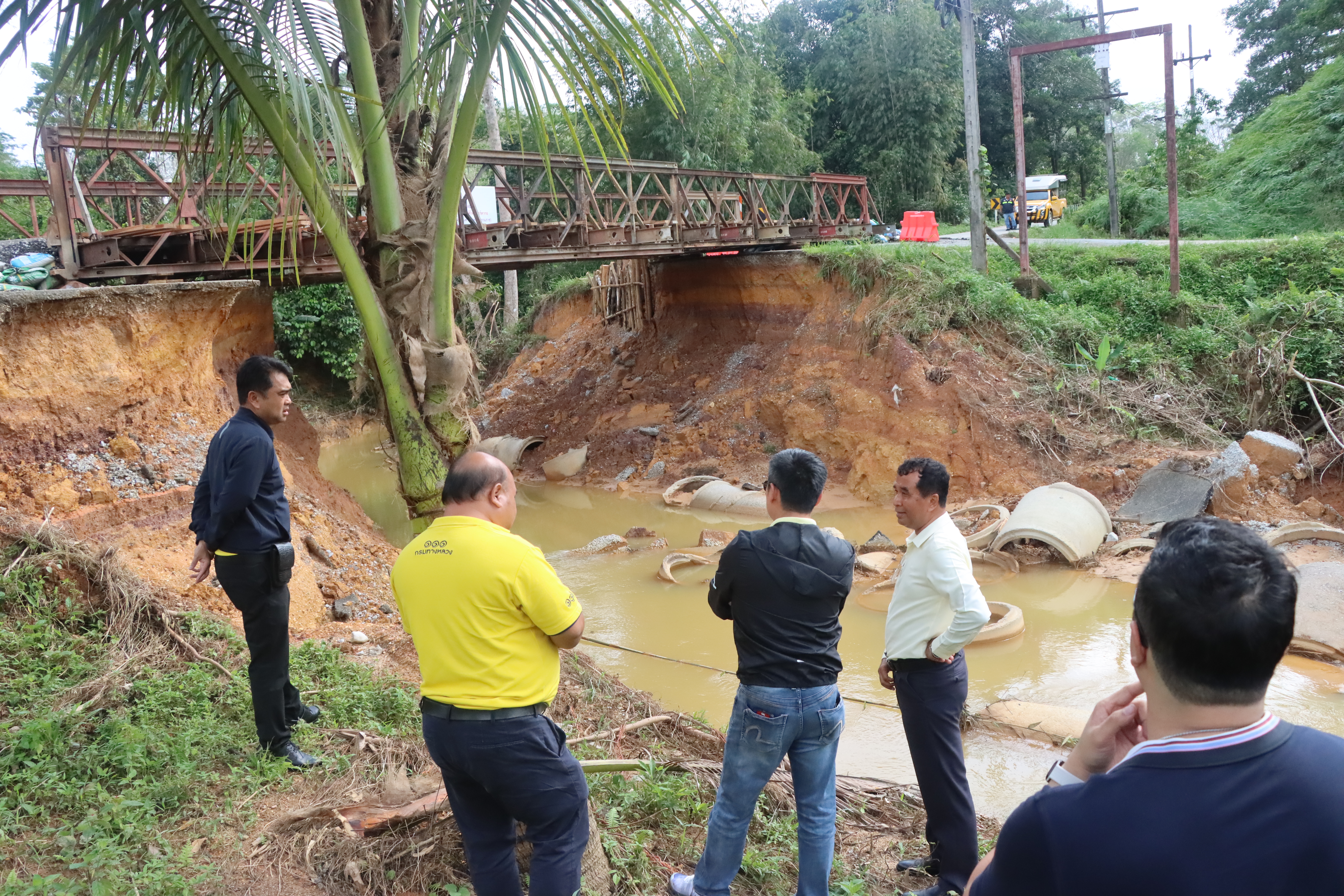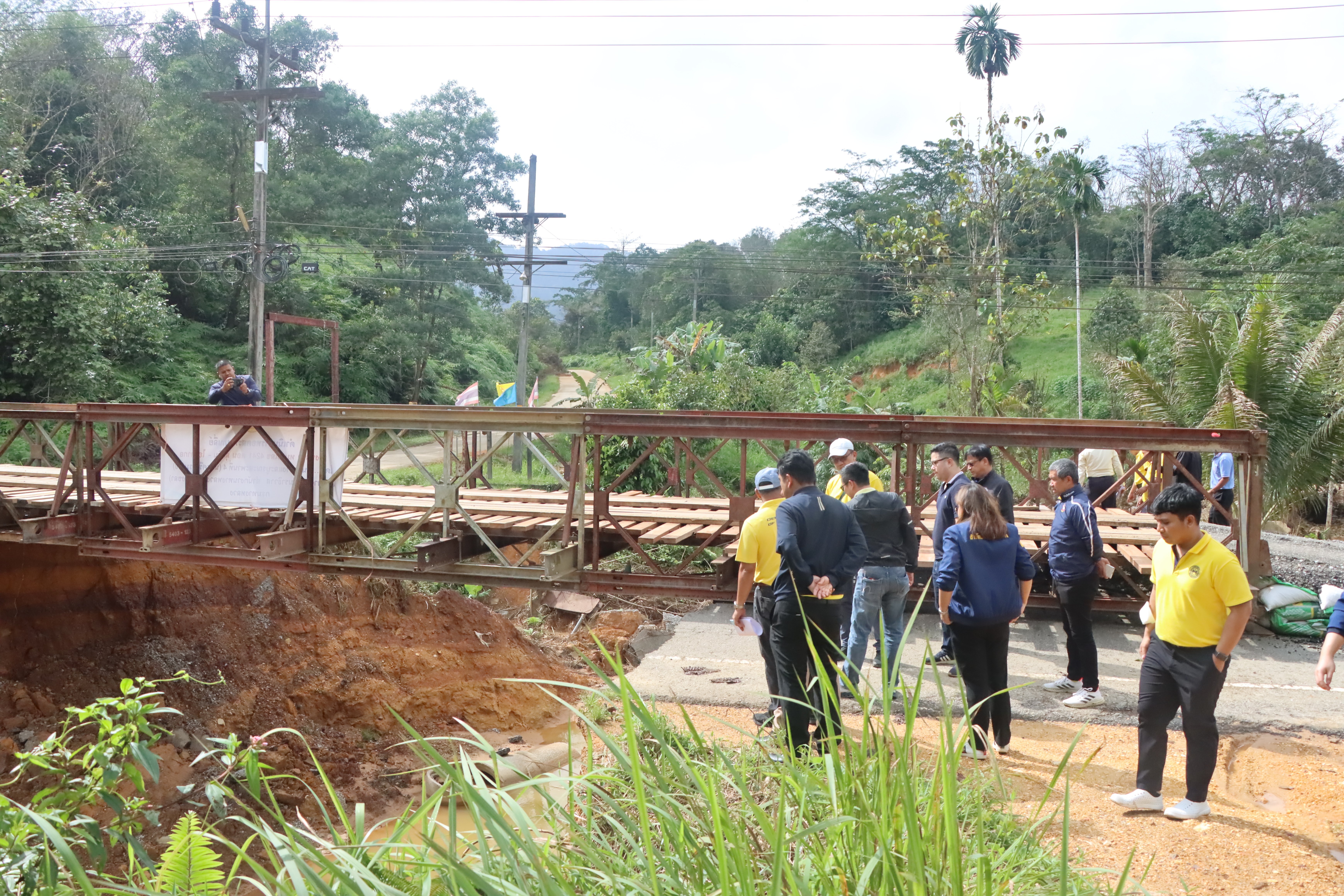 นายจิระพงศ์ เทพพิทักษ์ รองอธิบดีฝ่ายบำรุงทาง ลงพื้นที่ติดตามปัญหา และตรวจเส้นทางจากเหตุอุทกภัยในพื้นที่จังหวัดนราธิวาส โดยมีนายจอมปวีร์ จันทร์หิรัญ ผู้อำนวยการสำนักงานทางหลวงที่ 18 นายสมัคร เลือดวงหัด ผู้อำนวยการแขวงทางหลวงนราธิวาส พร้อมด้วยผู้อำนวยการส่วน ข้าราชการ และเจ้าหน้าที่ในสังกัด ร่วมลงพื้นที่ตรวจสอบจุดที่ได้รับผลกระทบจากอุทกภัย บริเวณทางหลวงหมายเลข 42410100 ตอน สุคิริน - ไอร์ตากอ ระหว่าง กม.10+220 ถึง กม.10+230 ตำบลสุคิริน อำเภอสุคิริน จังหวัดนราธิวาส เนื่องจากได้รับความเสียหายจากฝนตกหนักติดต่อกันเป็นระยะเวลาหลายวัน ตั้งแต่ 24 ธันวาคม 2566 - 4 มกราคม 2567 ที่ผ่านมา เกิดน้ำท่วม และน้ำป่าไหลหลาก ส่งผลให้ถนนถูกกัดเซาะได้รับความเสียหาย ประชาชนในพื้นที่ไม่สามารถสัญจรไปมาได้ จากสถานการณ์ฝนตกหนักอย่างต่อเนื่อง โดยจุดดังกล่าวศูนย์สร้างและบูรณะสะพานที่ 4 (นครศรีธรรมราช) ดำเนินการติดตั้งสะพานเบลีย์เพื่อเชื่อมทางขาด โดยแขวงทางหลวงนราธิวาส และสำนักงานทางหลวงที่ 18 ร่วมดำเนินการจนแล้วเสร็จในวันที่ 28 ธันวาคม2566 สามารถเปิดให้ประชาชนใช้สัญจรได้ชั่วคราว