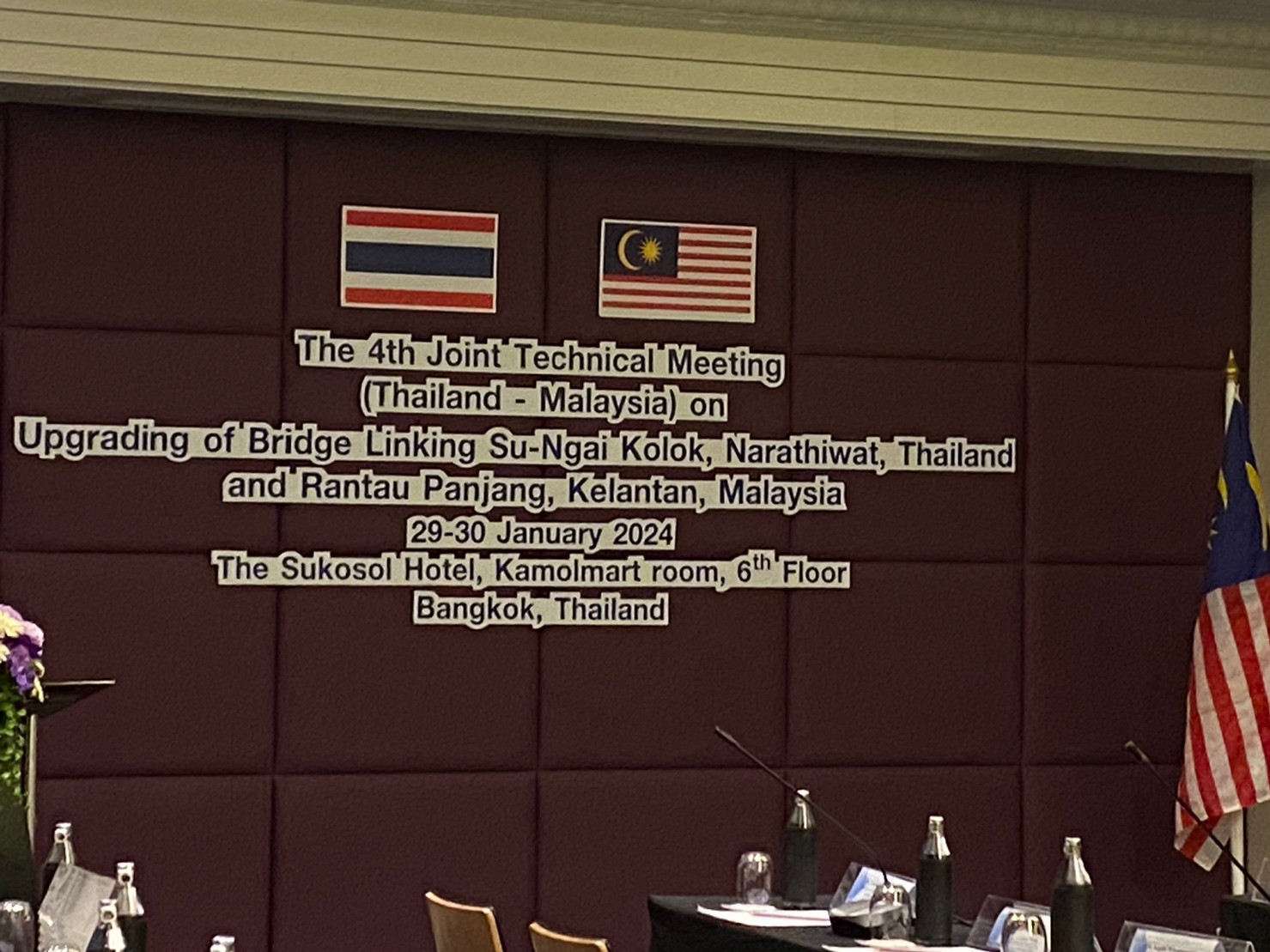 นายสมัคร เลือดวงหัด ผู้อำนวยการแขวงทางหลวงนราธิวาส พร้อมด้วยนางสาวนอร์ฟาอีระห์ เจ๊ะดาโอ๊ะ พนักงานโยธา ร่วมประชุมเตรียมการฝ่ายไทย และประชุมด้านเทคนิคร่วมไทย - มาเลเซีย ครั้งที่ 4 โครงการสะพานคู่ขนานแม่น้ำโก-ลก อำเภอสุไหงโก-ลก จังหวัดนราธิวาส โดยมี ดร.ดนัย เรืองสอน ผู้อำนวยการสำนักบริหารโครงการทางหลวงระหว่างประเทศ รักษาการในตำแหน่งวิศวกรใหญ่ด้านอำนวยความปลอดภัย กรมทางหลวง เป็นประธานในการประชุม พร้อมด้วยคณะเจ้าหน้าที่กรมทางหลวง และกระทรวงโยธาธิการ ประเทศมาเลเซีย MINISTRY OF WORKS (MOW) และกรมโยธาธิการ ประเทศมาเลเซีย PUBLIC WORKS DEPARTMENT (PWD) และหน่วยงานที่เกี่ยวข้องเข้าร่วมประชุม ณ ห้องประชุมกมลมาศ ชั้น 6 โรงแรมสุโกศล กรุงเทพมหานคร