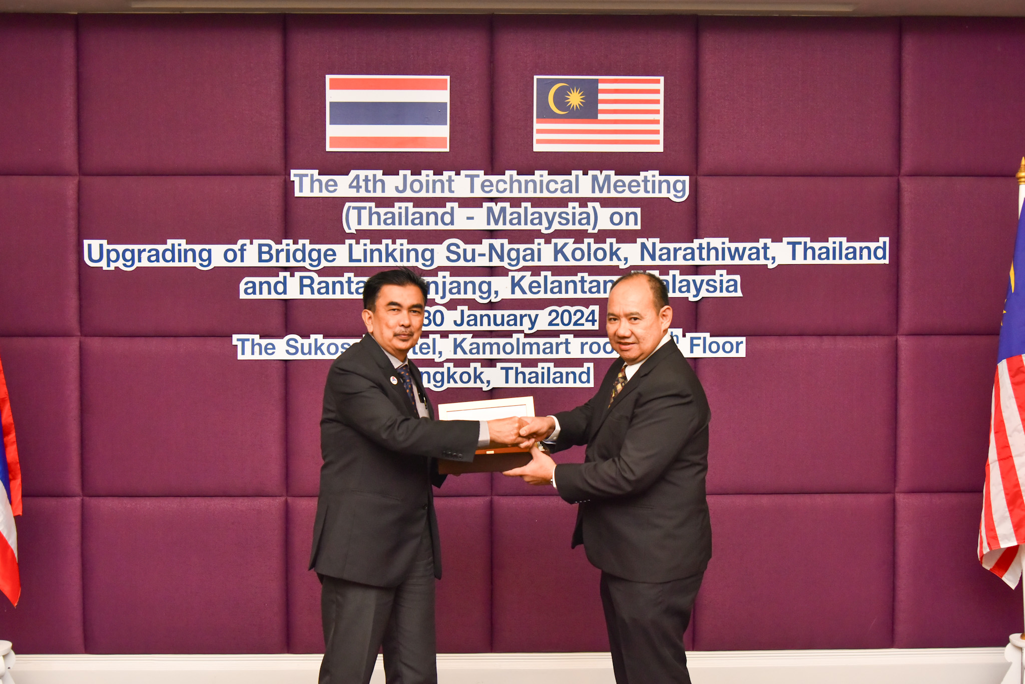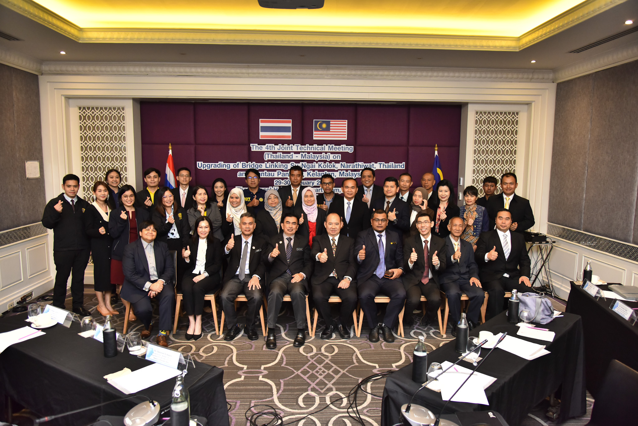 นายสมัคร เลือดวงหัด ผู้อำนวยการแขวงทางหลวงนราธิวาส พร้อมด้วยนางสาวนอร์ฟาอีระห์ เจ๊ะดาโอ๊ะ พนักงานโยธา ร่วมประชุมเตรียมการฝ่ายไทย และประชุมด้านเทคนิคร่วมไทย - มาเลเซีย ครั้งที่ 4 โครงการสะพานคู่ขนานแม่น้ำโก-ลก อำเภอสุไหงโก-ลก จังหวัดนราธิวาส เป็นวันที่ 2 โดยมี ดร.ดนัย เรืองสอน ผู้อำนวยการสำนักบริหารโครงการทางหลวงระหว่างประเทศ รักษาการในตำแหน่งวิศวกรใหญ่ด้านอำนวยความปลอดภัย กรมทางหลวง เป็นประธานในการประชุม พร้อมด้วยคณะเจ้าหน้าที่กรมทางหลวง และกระทรวงโยธาธิการ ประเทศมาเลเซีย MINISTRY OF WORKS (MOW) และกรมโยธาธิการ ประเทศมาเลเซีย PUBLIC WORKS DEPARTMENT (PWD) และหน่วยงานที่เกี่ยวข้องเข้าร่วมประชุม ณ ห้องประชุมกมลมาศ ชั้น 6 โรงแรมสุโกศล กรุงเทพมหานคร