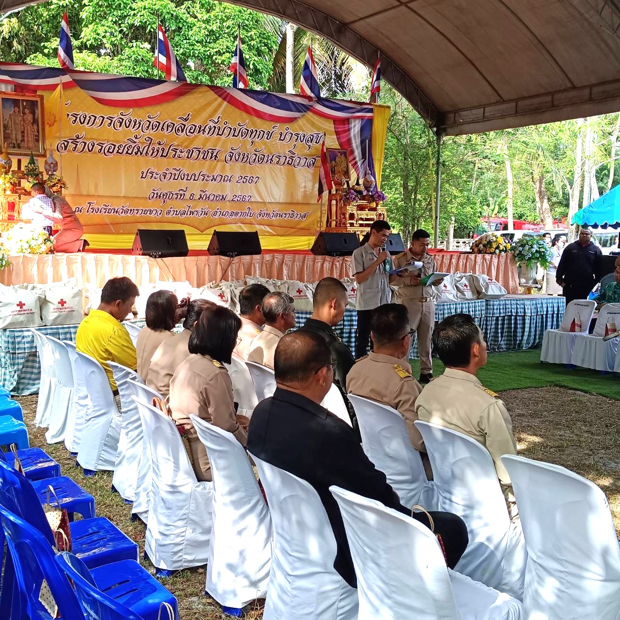 นายจอมปวีร์ จันทร์หิรัญ ผู้อำนวยการสำนักงานทางหลวงที่ 18 รักษาราชการแทน ผู้อำนวยการแขวงทางหลวงนราธิวาส มอบหมายให้นายนิรันดร์ โสตติมานนท์ รักษาการในตำแหน่ง หัวหน้าหมวดทางหลวงตากใบ เข้าร่วมโครงการจังหวัดเคลื่อนที่ "บำบัดทุกข์ บำรุงสุข สร้างรอยยิ้มให้ประชาชน" ประจำปี 2567 ณ โรงเรียนวัดทรายขาว หมู่ที่ 2 ตำบลไพรวัน อำเภอตากใบ จังหวัดนราธิวาส โดยมีว่าที่ร้อยตรี ตระกูล โทธรรม ผู้ว่าราชการจังหวัดนราธิวาส เป็นประธานเปิดโครงการจังหวัดเคลื่อนที่ "บำบัดทุกข์ บำรุงสุข สร้างรอยยิ้มให้ประชาชน" ประจำปี 2567 พร้อมด้วยหัวหน้าส่วนราชการรัฐวิสาหกิจ เอกชนและประชาชนในพื้นที่เข้าร่วม