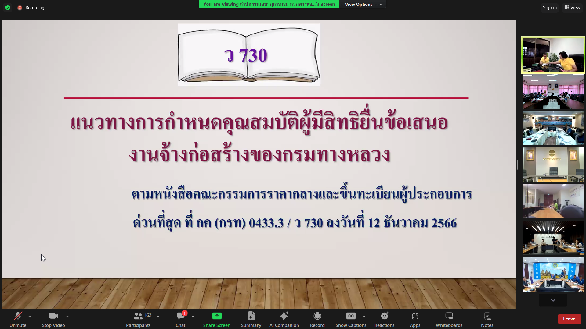 นายจอมปวีร์ จันทร์หิรัญ ผู้อำนวยการสำนักงานทางหลวงที่ 18 รักษาราชการแทน ผู้อำนวยการแขวงทางหลวงนราธิวาส มอบหมายให้นายธวัชชัย เผนานนท์ รองผู้อำนวยการแขวงทางหลวงนราธิวาส ฝ่ายวิศวกรรม นางอรัญญา เพ็ชรพูล รองผู้อำนวยการแขวงทางหลวงนราธิวาส ฝ่ายบริหาร นางอุบลวรรณ วั่นเซ่ง หัวหน้างานพัสดุและสัญญา พร้อมด้วยนายสุธี มณีอ่อน ผู้อำนวยการส่วนควบคุมงานก่อสร้าง นายสาโรจน์ ขุนจันทร์ ผู้อำนวยการส่วนเครื่องกล สำนักงานทางหลวงที่ 18 และเจ้าหน้าที่ที่เกี่ยวข้อง เข้าร่วมประชุมซักซ้อมแนวทางปฏิบัติในการกำหนดคุณสมบัติผู้มีสิทธิยื่นข้อเสนองานจ้างก่อสร้างตามหนังสือคณะกรรมการราคากลางและขึ้นทะเบียนผู้ประกอบการ ผ่านระบบ Zoom Meeting ณ ห้องประชุม ชั้น 3 แขวงทางหลวงนราธิวาส โดยมีโดยมีนายสราวุธ ทรงศิวิไล อธิบดีกรมทางหลวง เป็นประธานในการประชุม