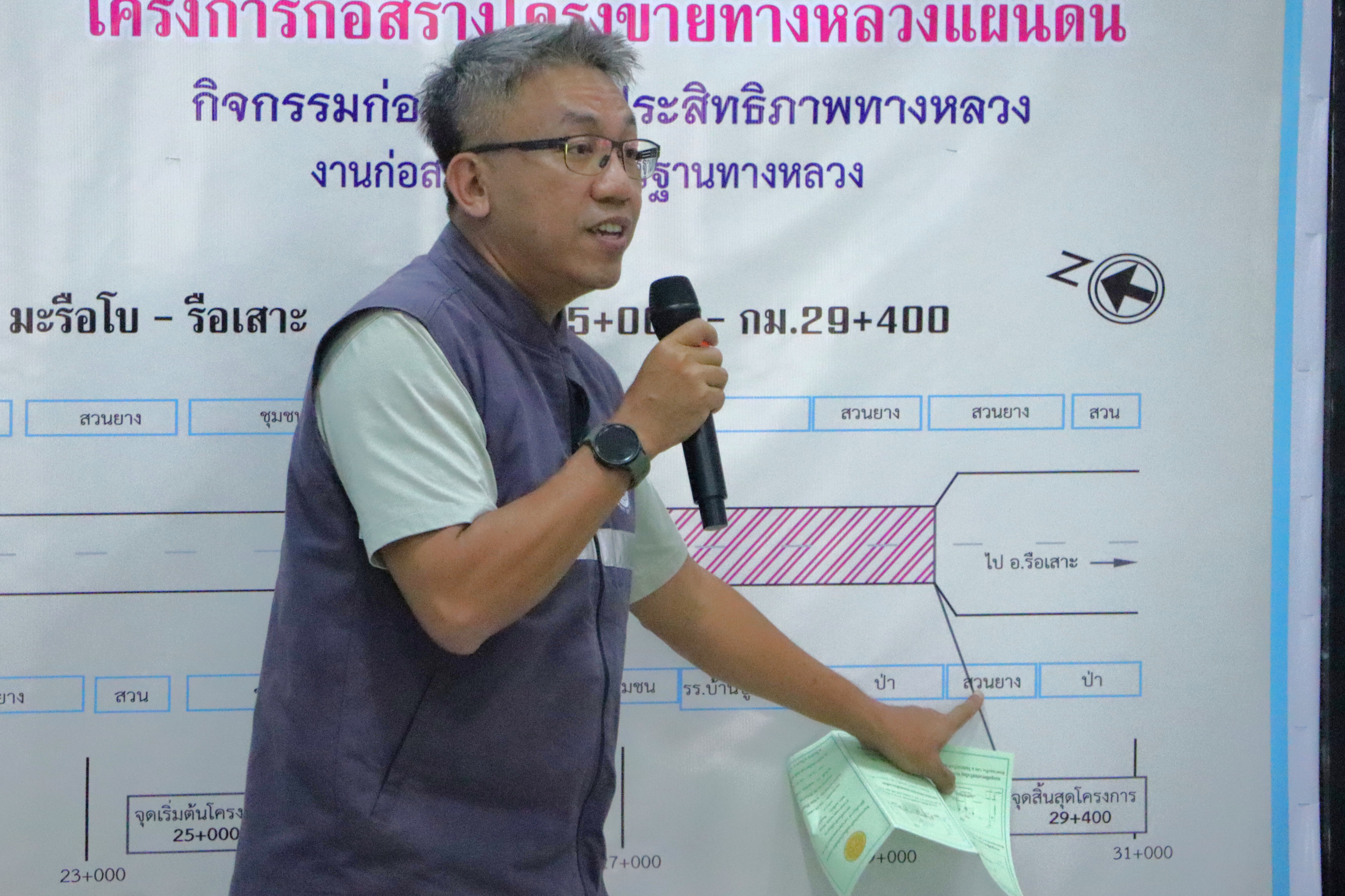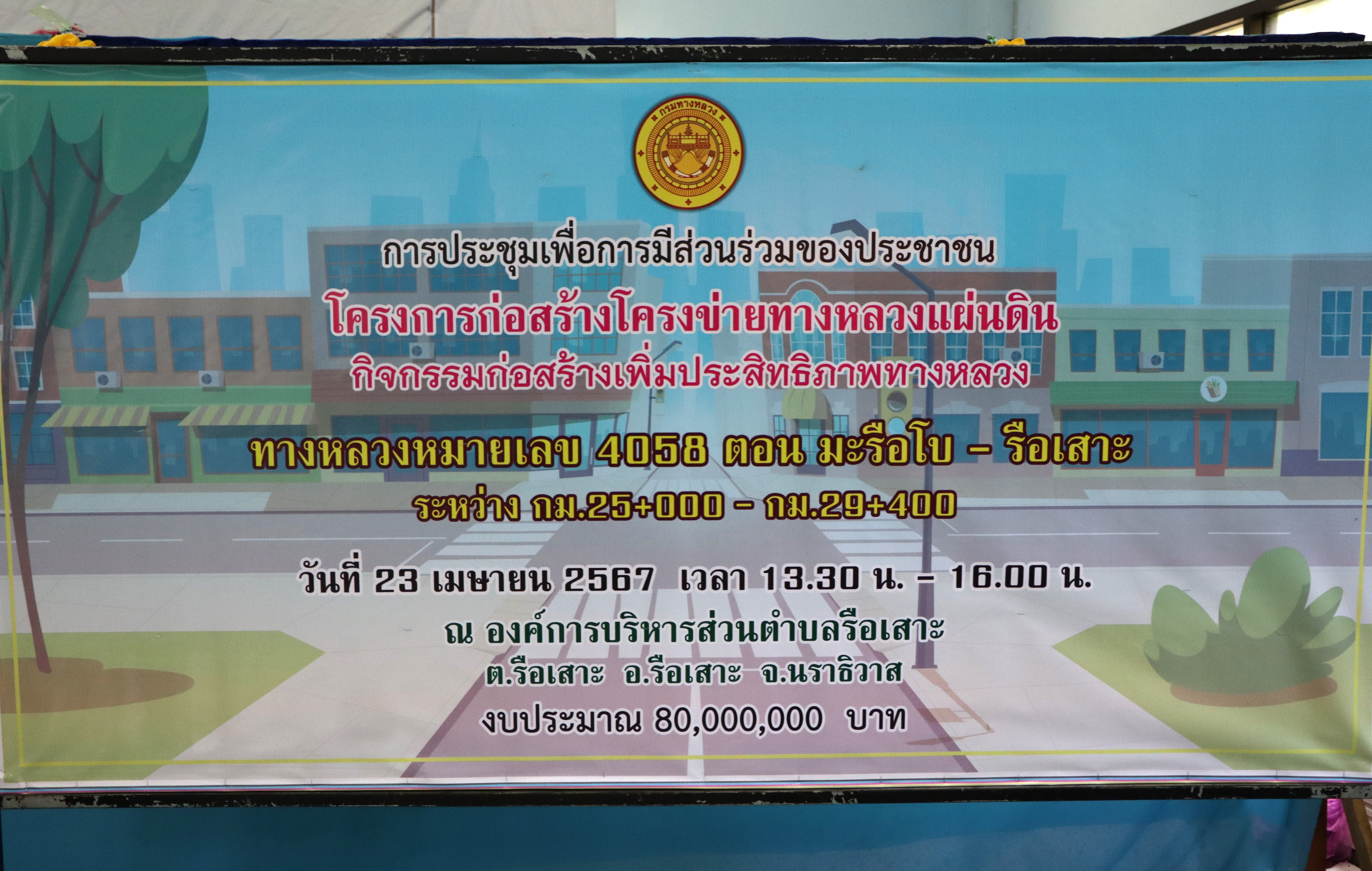 ในการนี้มีนายวีรพัฒน์ บุณฑริก รองผู้ว่าราชการจังหวัดนราธิวาส เป็นประธานการเปิดพิธี นายพรเทพ ธีระกุล ผู้อำนวยการส่วนสำรวจและออกแบบ สำนักงานทางหลวงที่ 18 นายศุภชัย พรหมประทีป นายช่างโยธาอาวุโส นายวินัย บิลหมุด หัวหน้าหมวดทางหลวงรือเสาะ ร่วมบรรยายรูปแบบรายละเอียดการก่อสร้างโครงการ โดยร่วมตอบข้อเสนอแนะและความคิดเห็นเกี่ยวกับโครงการดังกล่าว เพื่อให้สอดคล้องกับความต้องการของประชาชน ณ องค์การบริหารส่วนตำบลรือเสาะ ตำบลรือเสาะ อำเภอรือเสาะ จังหวัดนราธิวาส