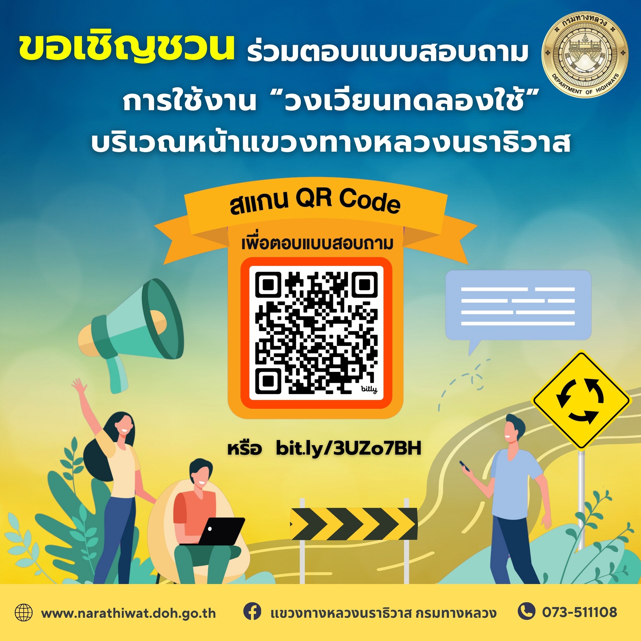 แขวงทางหลวงนราธิวาส ขอเชิญชวนผู้ใช้ทาง ร่วมตอบแบบสอบถามการใช้งาน “วงเวียนทดลองใช้” บริเวณหน้าแขวงทางหลวงนราธิวาส
