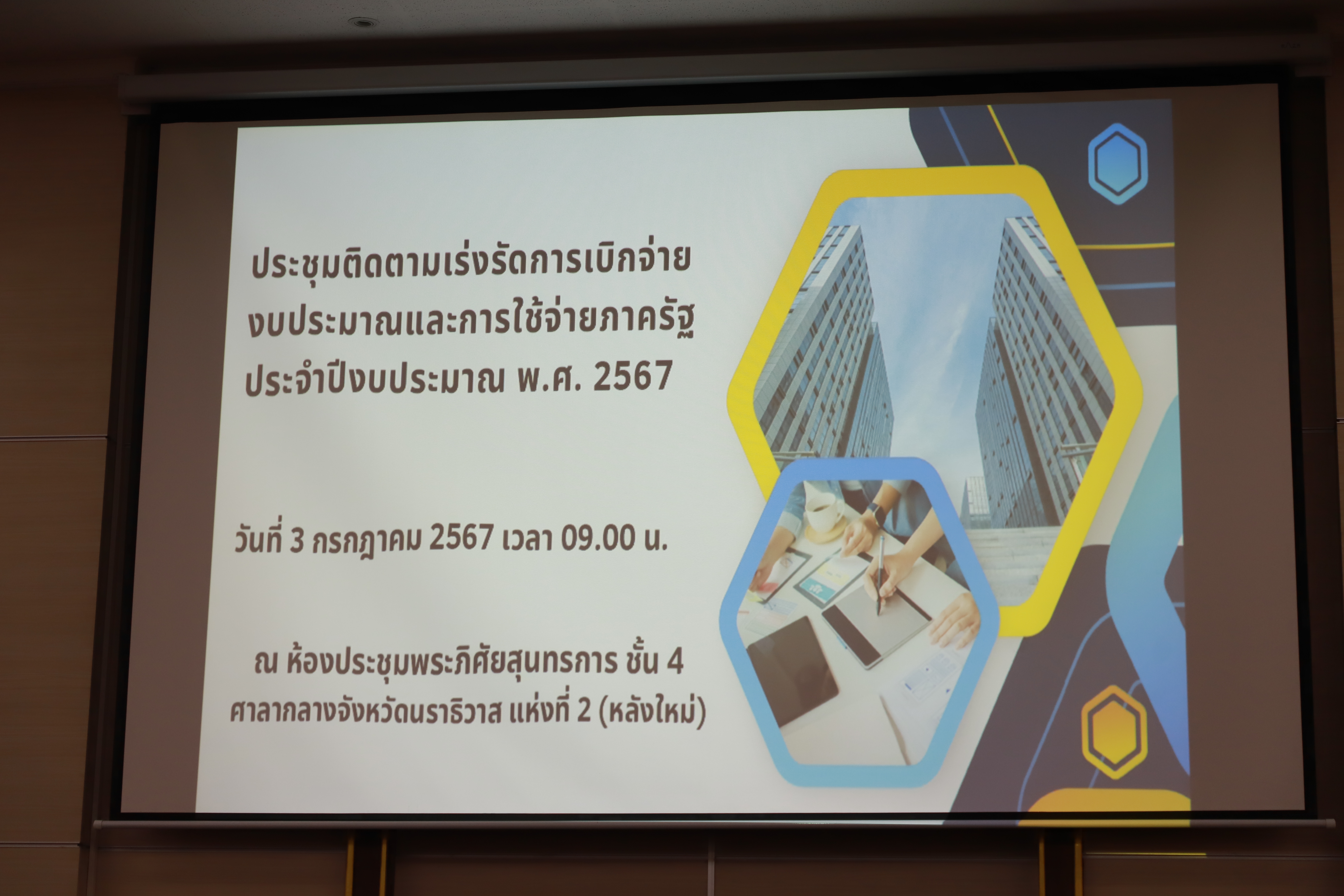 นายปฏิเวชวุฒิศักย์ สุขขี ผู้อำนวยการแขวงทางหลวงนราธิวาส มอบหมายให้นางอรัญญาเพ็ชรพูล รองผู้อำนวยการแขวงทางหลวงนราธิวาส (ฝ่ายบริหาร) และนางอุบลวรรณ วั่นเซ่ง หัวหน้างานพัสดุและสัญญา เข้าร่วมประชุมติดตามเร่งรัดการเบิกจ่ายงบประมาณและการใช้จ่ายภาครัฐ ประจำปีงบประมาณ พ.ศ.2567 โดยติดตามความก้าวหน้าการจัดทำโครงการตามแผนพัฒนาจังหวัดประจำปีงบประมาณ พ.ศ.2567 ของส่วนราชการ ที่ได้รับการจัดสรรงบประมาณ จำนวน 22 หน่วยงาน, เงินอุดหนุนเฉพาะกิจองค์กรปกครองส่วนท้องถิ่น ประจำปีงบประมาณ พ.ศ.2567 รวมทั้งติดตามเร่งรัดการเบิกจ่ายเงินกันไว้เบิกเหลื่อมปี พ.ศ.2566 ของส่วนราชการ จำนวน 9 หน่วยงาน เพื่อให้เป็นไปตามแผนงานโครงการ ณ ห้องประชุมพระภิศัยสุนทรการ ชั้น 4 ศาลากลางจังหวัดนราธิวาส แห่งที่ 2 โดยว่าที่ร้อยตรี ตระกูล โทธรรม ผู้ว่าราชการจังหวัดนราธิวาส เป็นประธานการประชุม พร้อมด้วยส่วนราชการที่เกี่ยวข้อง เข้าร่วมประชุมดังกล่าว