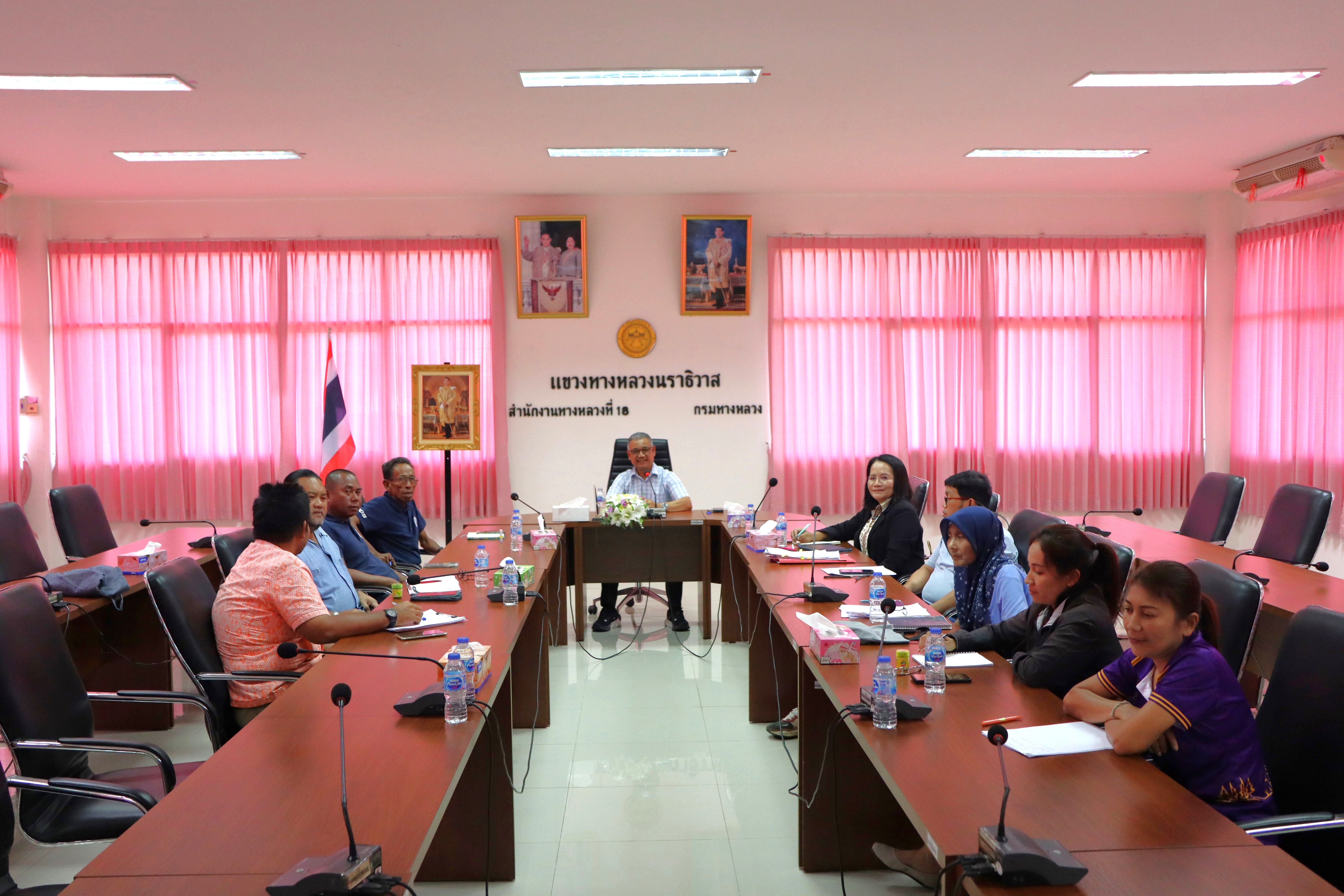 นายปฏิเวชวุฒิศักย์ สุขขี ผู้อำนวยการแขวงทางหลวงนราธิวาส พร้อมด้วยรองผู้อำนวยการแขวงทางหลวงนราธิวาส ฝ่ายบริหาร หัวหน้างาน หัวหน้าหมวดทางหลวง ข้าราชการ และเจ้าหน้าที่ ร่วมประชุมพิจารณาการดำเนินงานเพื่อแต่งตั้งคณะทำงานตรวจสอบและติดตามผลการดำเนินงานซ่อมแซมทรัพย์สินในเขตพื้นที่แขวงทางหลวงนราธิวาส และติดตามการปฏิบัติงานการรายงานอุบัติเหตุ ณ ห้องประชุม ชั้น 3 แขวงทางหลวงนราธิวาส