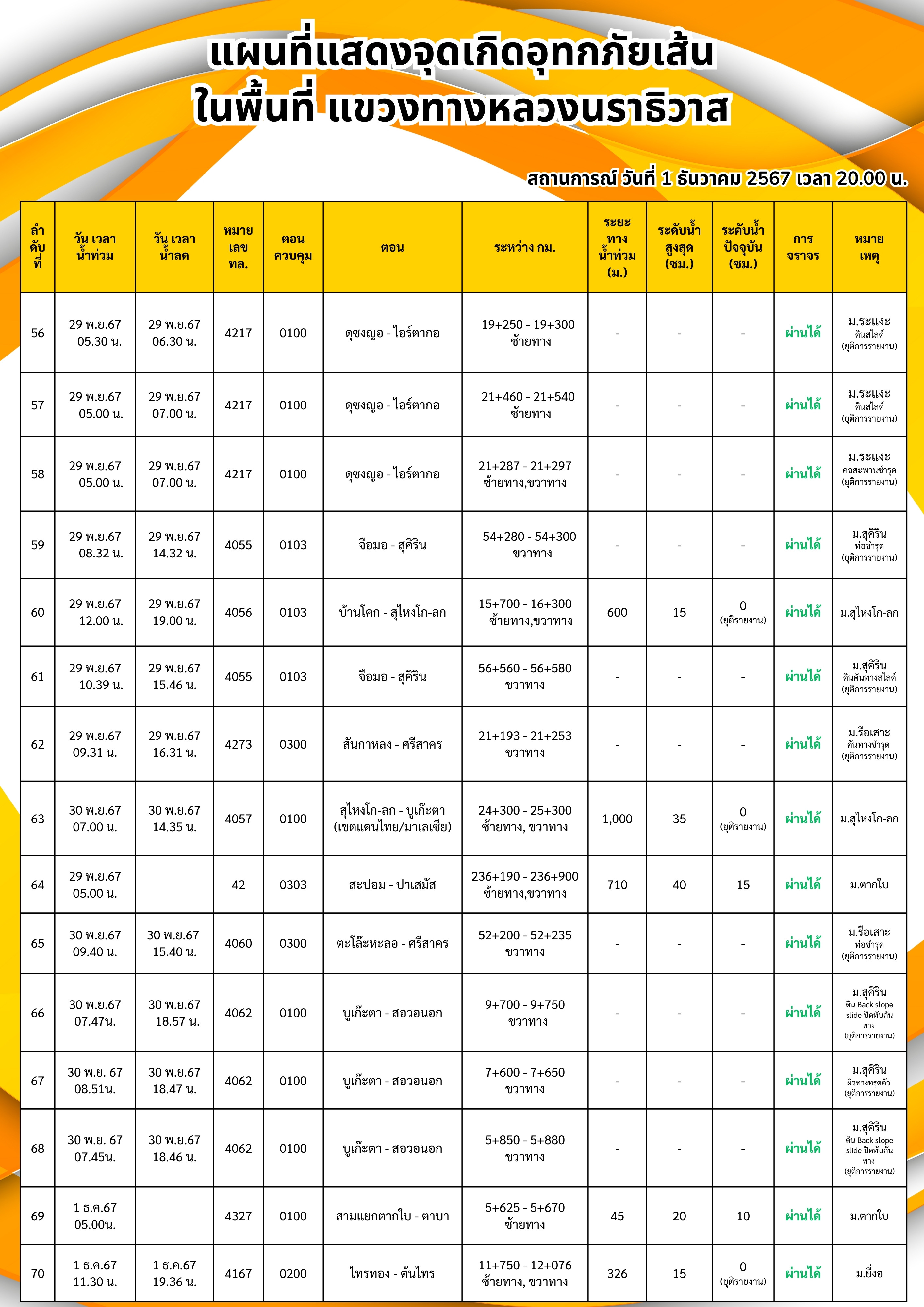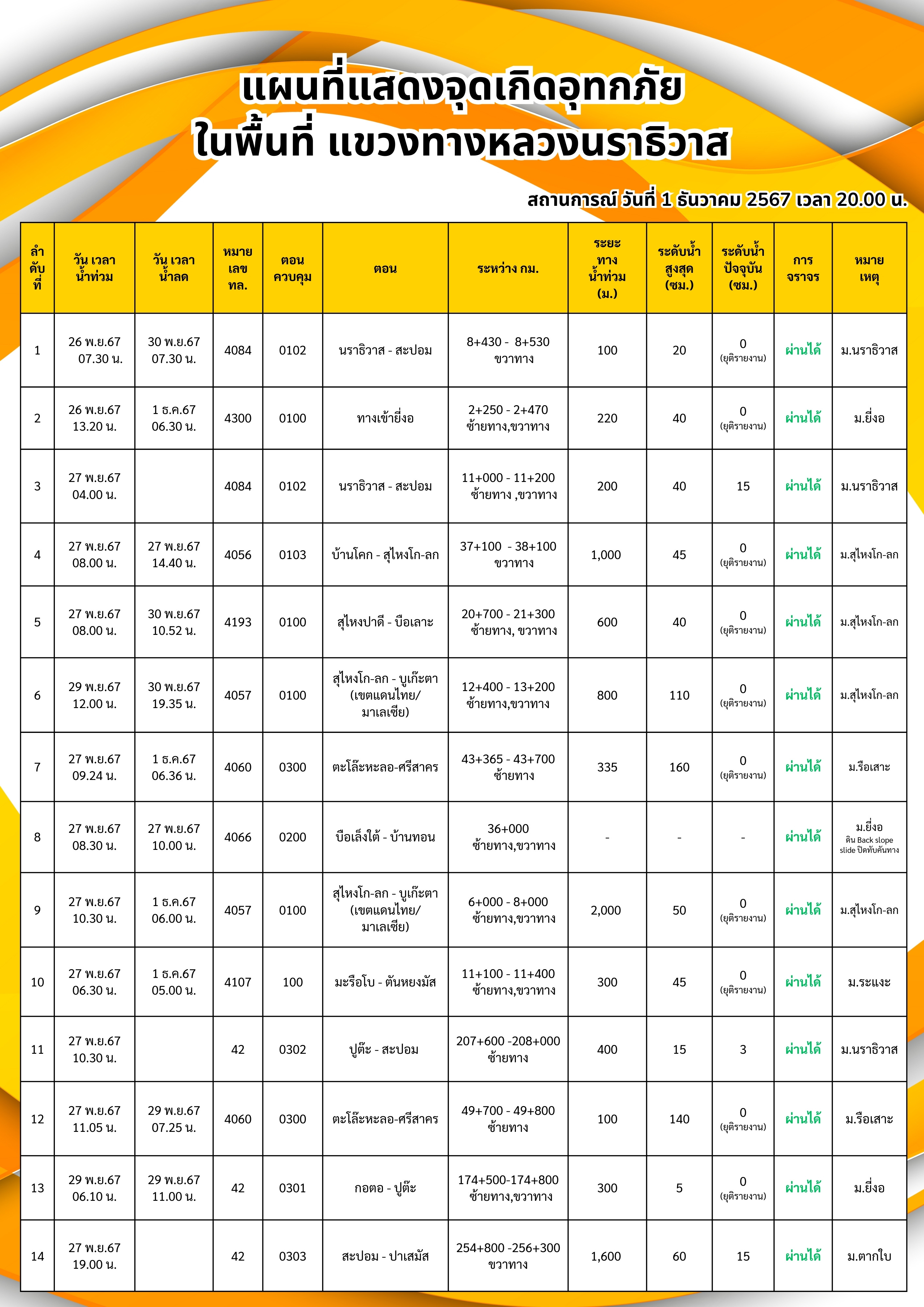 รายงานสถานการณ์อุทกภัยในพื้นที่จังหวัดนราธิวาส วันเวลาที่ update วันที่ 1 ธ.ค. 67 เวลา 20.00 น.
