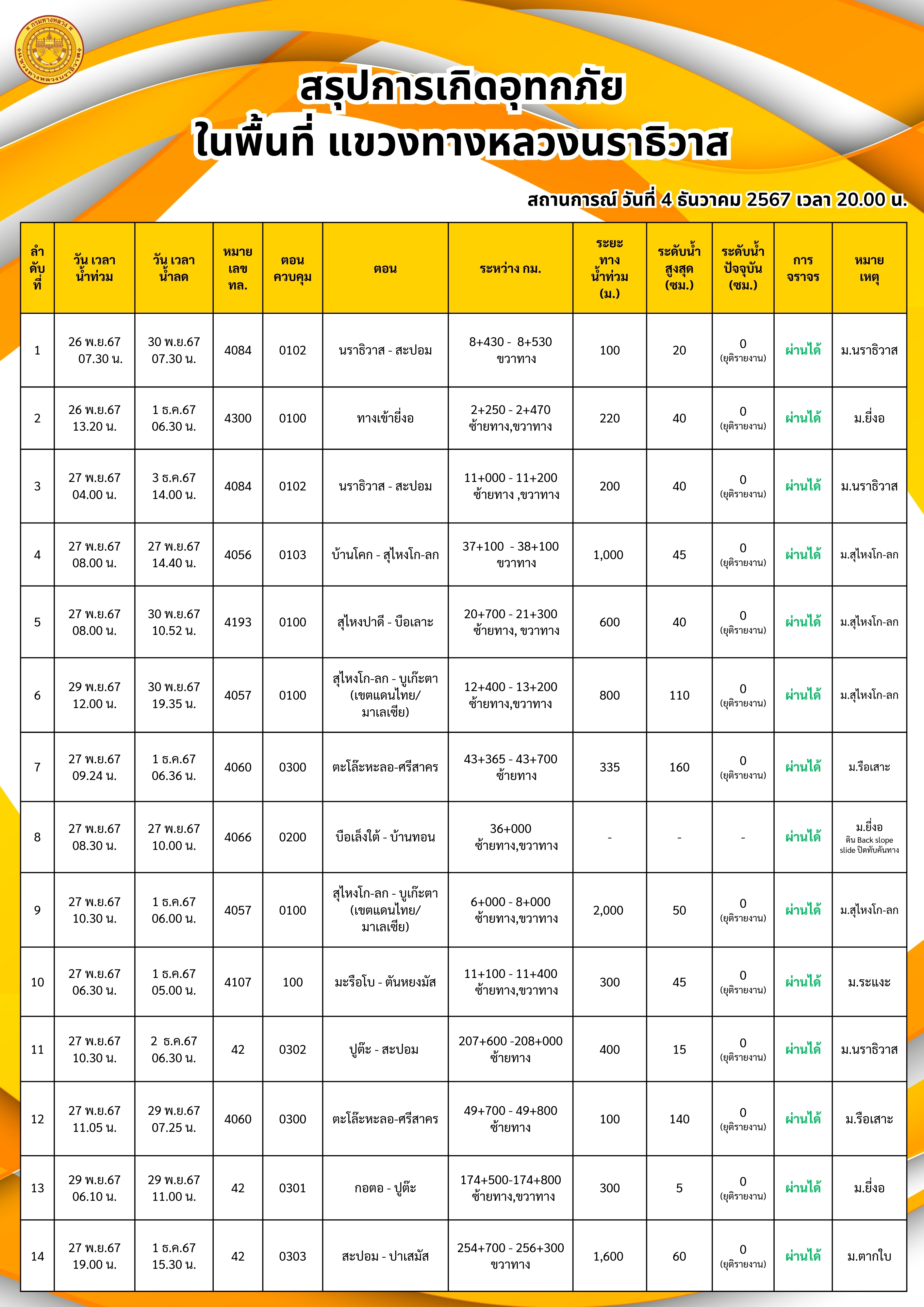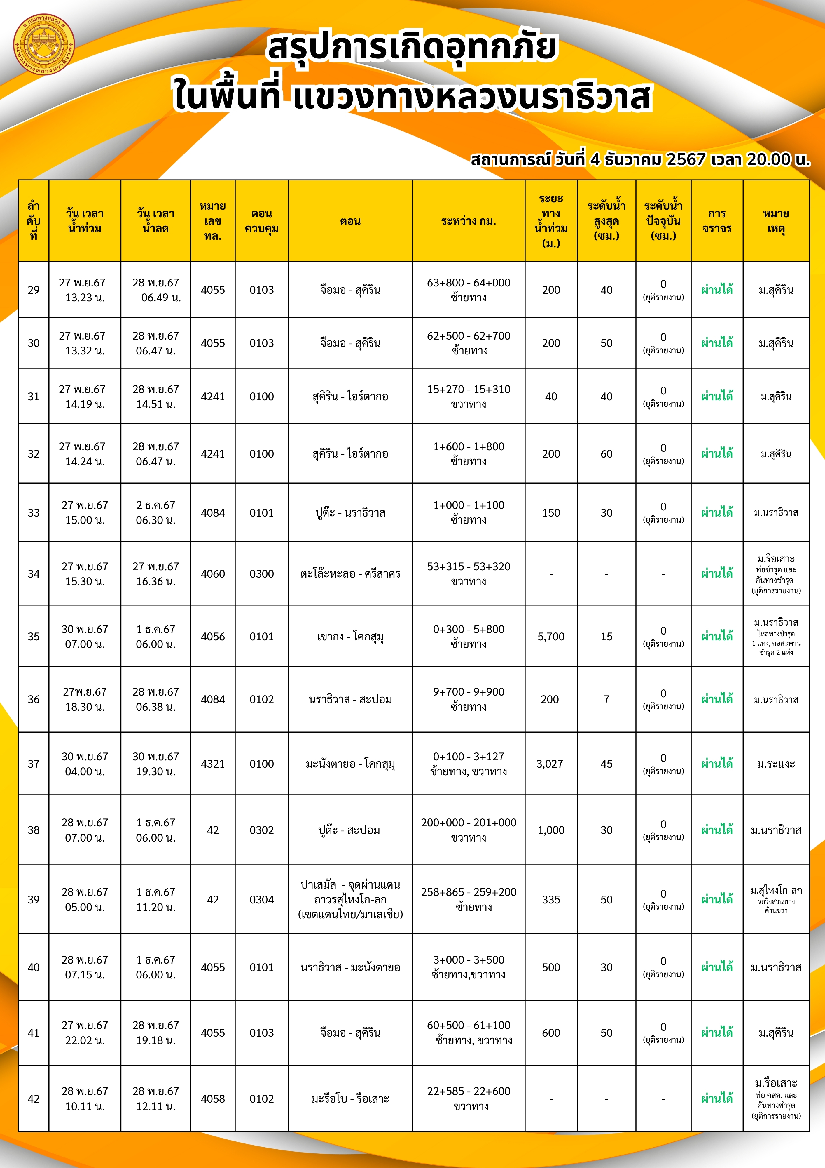 แขวงทางหลวงนราธิวาส ขอรายงานสถานการณ์อุทกภัยในพื้นที่จังหวัดนราธิวาส วันเวลาที่ update วันที่ 4 ธ.ค. 67 เวลา 20.00 น.