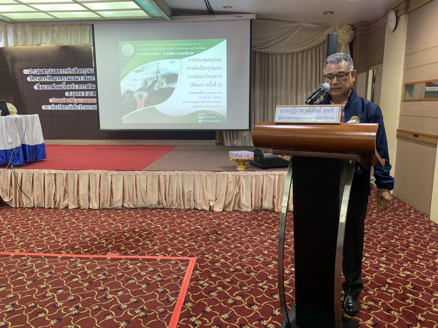นายปฏิเวชวุฒิศักย์ สุขขี ผู้อำนวยการแขวงทางหลวงนราธิวาส พร้อมด้วยนางสาวศุภวรรณ์ นวลละออง วิศวกรโยธาปฏิบัติการ ร่วมประชุมสรุปผลการคัดเลือกรูปแบบการพัฒนาโครงการ (สัมมนา ครั้งที่ 2) โครงการศึกษาความเหมาะสมทางด้านเศรษฐกิจ วิศวกรรม และผลกระทบด้านสิ่งแวดล้อมเบื้องต้น การพัฒนาโครงข่ายทางหลวงแนวใหม่เชื่อมโยง อ.เบตง จ.ยะลา - อ.สุคิริน จ.นราธิวาส ณ ห้องประชุมโสภาพิสัย ชั้น 6 โรงแรมตันหยง อ.เมืองนราธิวาส จ.นราธิวาส โดยมีนายกฤษณนันท์ กำไร รองผู้ว่าราชการจังหวัดนราธิวาส เป็นประธานในพิธีเปิดการประชุม พร้อมด้วยส่วนราชการที่เกี่ยวข้อง ผู้นำชุมชน เข้าร่วมการประชุมดังกล่าว