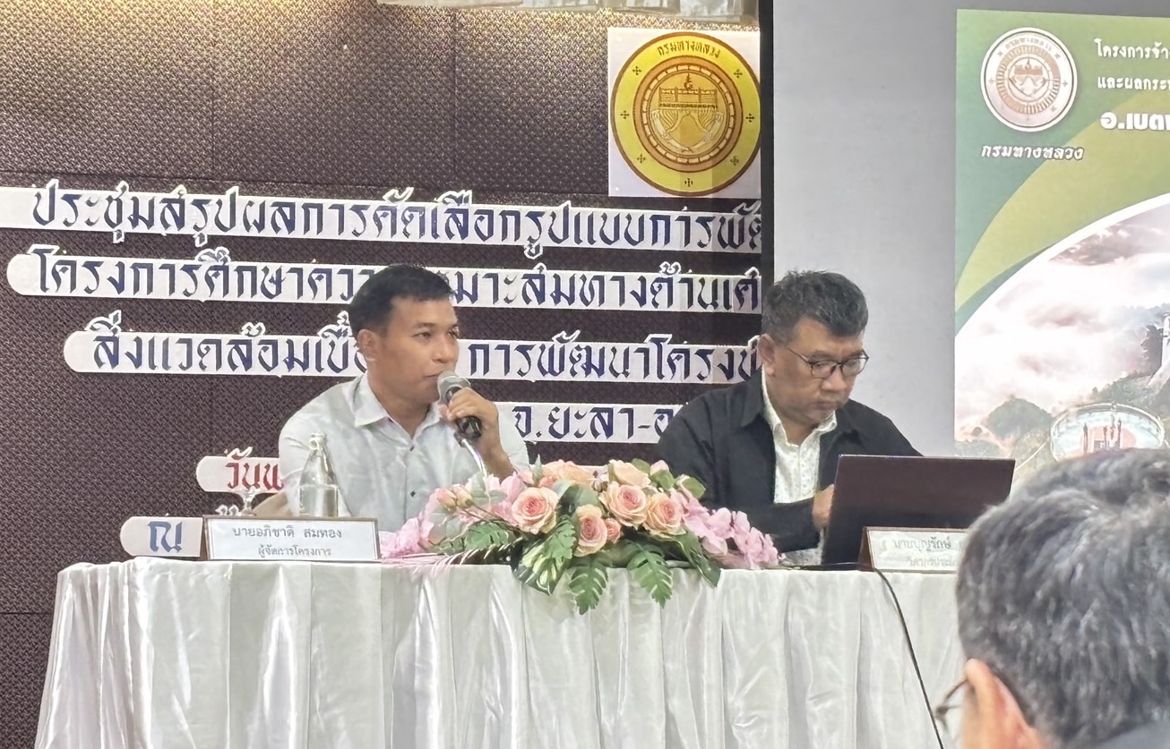แขวงฯนราธิวาส ร่วมประชุมสรุปผลการคัดเลือกรูปแบบการพัฒนาโครงการ (สัมมนา ครั้งที่ 2) โครงการศึกษาความเหมาะสมทางด้านเศรษฐกิจ วิศวกรรม และผลกระทบด้านสิ่งแวดล้อมเบื้องต้น การพัฒนาโครงข่ายทางหลวงแนวใหม่เชื่อมโยง อ.เบตง จ.ยะลา - อ.สุคิริน จ.นราธิวาส