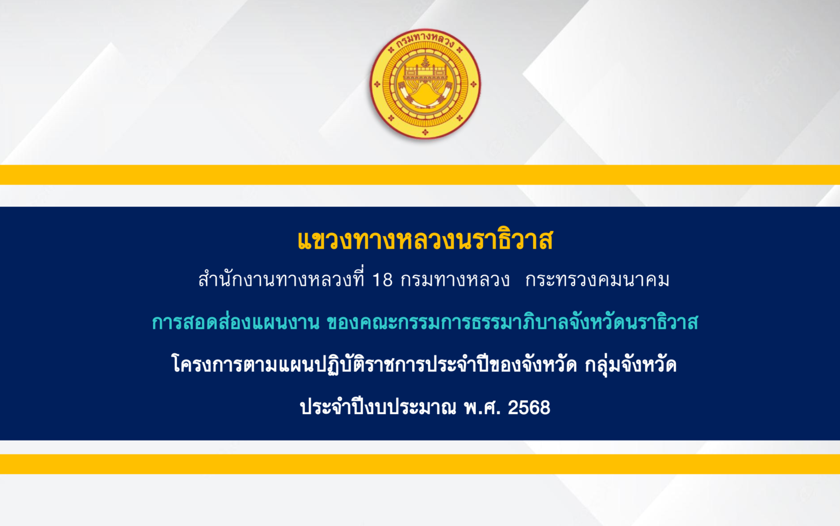นายปฏิเวชวุฒิศักย์ สุขขี ผู้อำนวยการแขวงทางหลวงนราธิวาส มอบหมายให้รองผู้อำนวยการแขวงทางหลวง วิศวกรรม ฝ่ายบริหาร หัวหน้าหมวดทางหลวงสุคิริน หัวหน้าหมวดสุไหงโก-ลก และข้าราชการ และเจ้าหน้าที่เกี่ยวข้อง ร่วมกับคณะกรรมการธรรมาภิบาลจังหวัดนราธิวาส (ก.ธ.จ.นราธิวาส) ร่วมประชุมและติดตามโครงการตามแผนปฏิบัติราชการประจำปีของจังหวัด งบกลุ่มจังหวัดและงบกลุ่มจังหวัด ประจำปีงบประมาณ 2568 โดยมีการติดตามแผนการดำเนินงานและการดำเนินงานการจัดซื้อจัดจ้าง ณ ห้องประชุม ชั้น 3 แขวงทางหลวงนราธิวาส