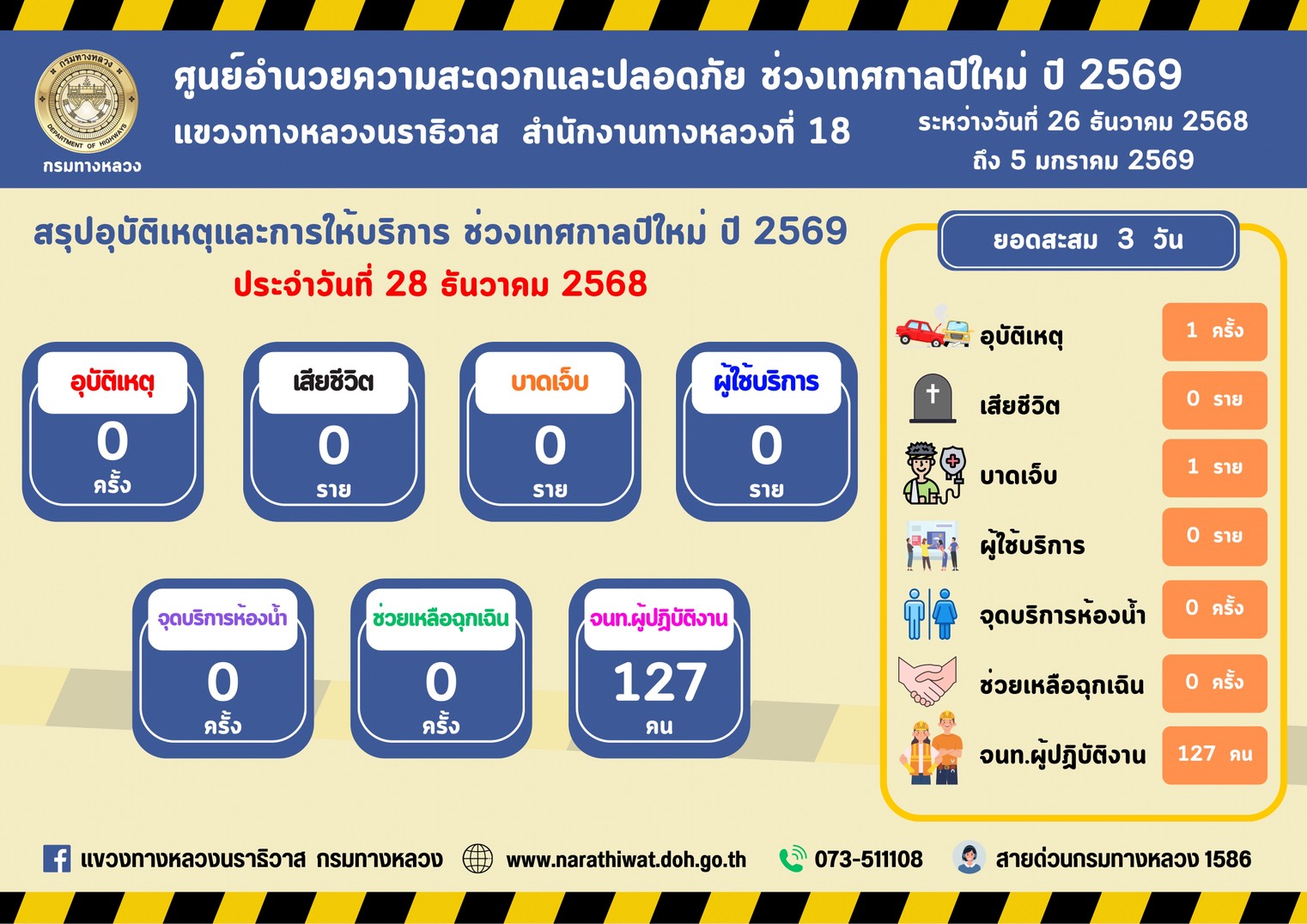 สรุปรายงานอุบัติเหตุและการให้บริการช่วงเทศกาลปีใหม่ 2569 ประจำวันที่ 28 ธันวาคม 2568