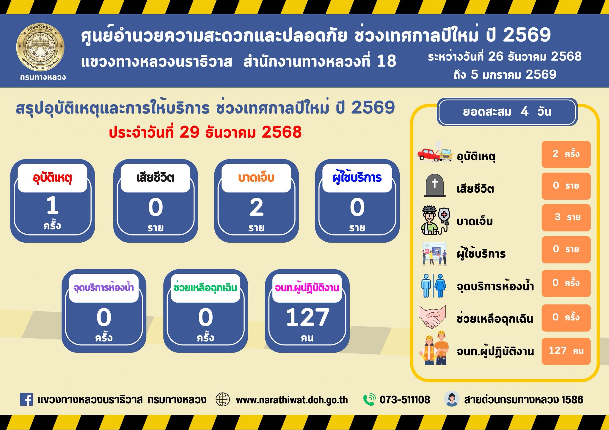 สรุปรายงานอุบัติเหตุและการให้บริการช่วงเทศกาลปีใหม่ 2569 ประจำวันที่ 29 ธันวาคม 2568