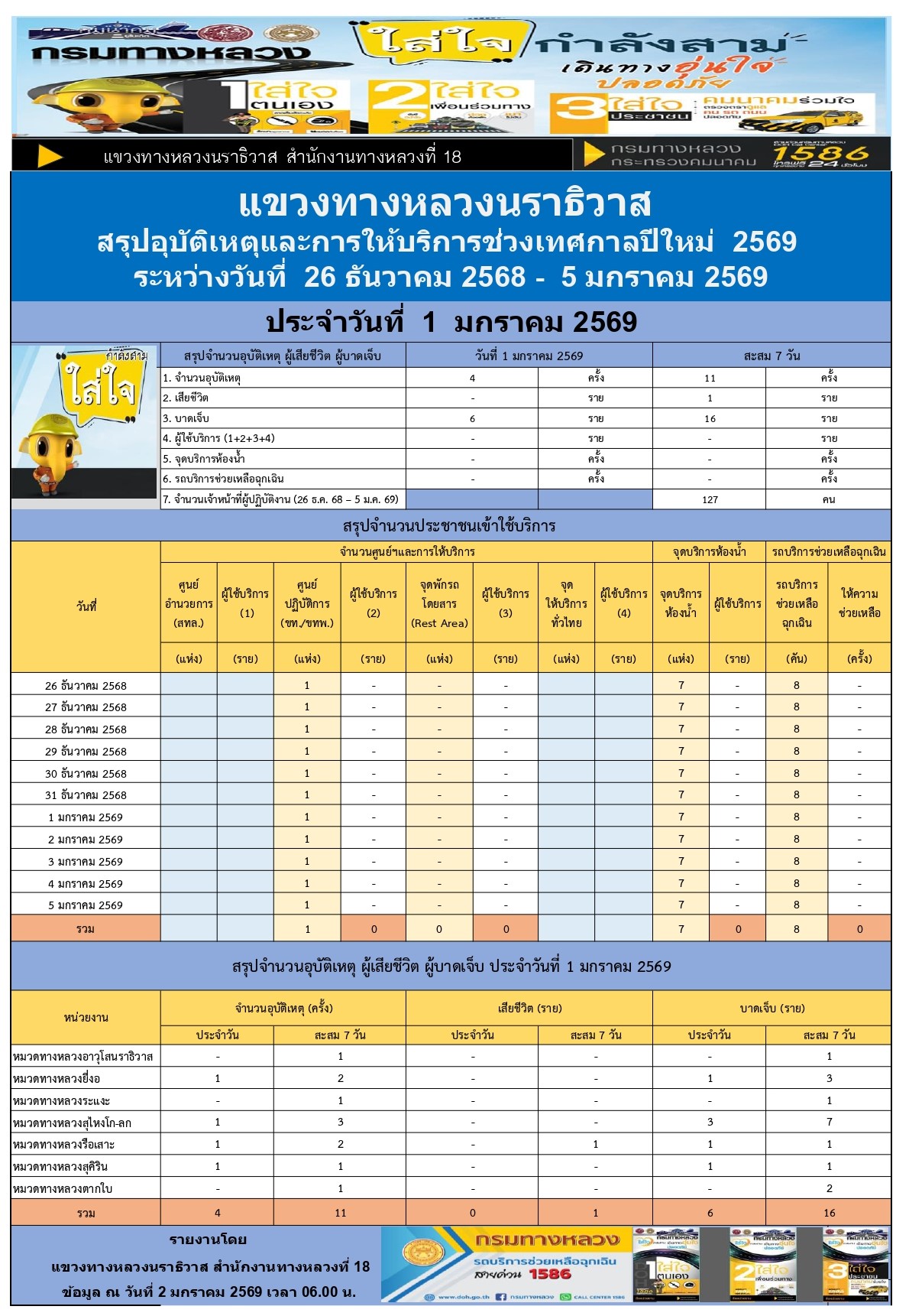 สรุปรายงานอุบัติเหตุและการให้บริการช่วงเทศกาลปีใหม่ 2569 ประจำวันที่ 1 มกราคม 2569
