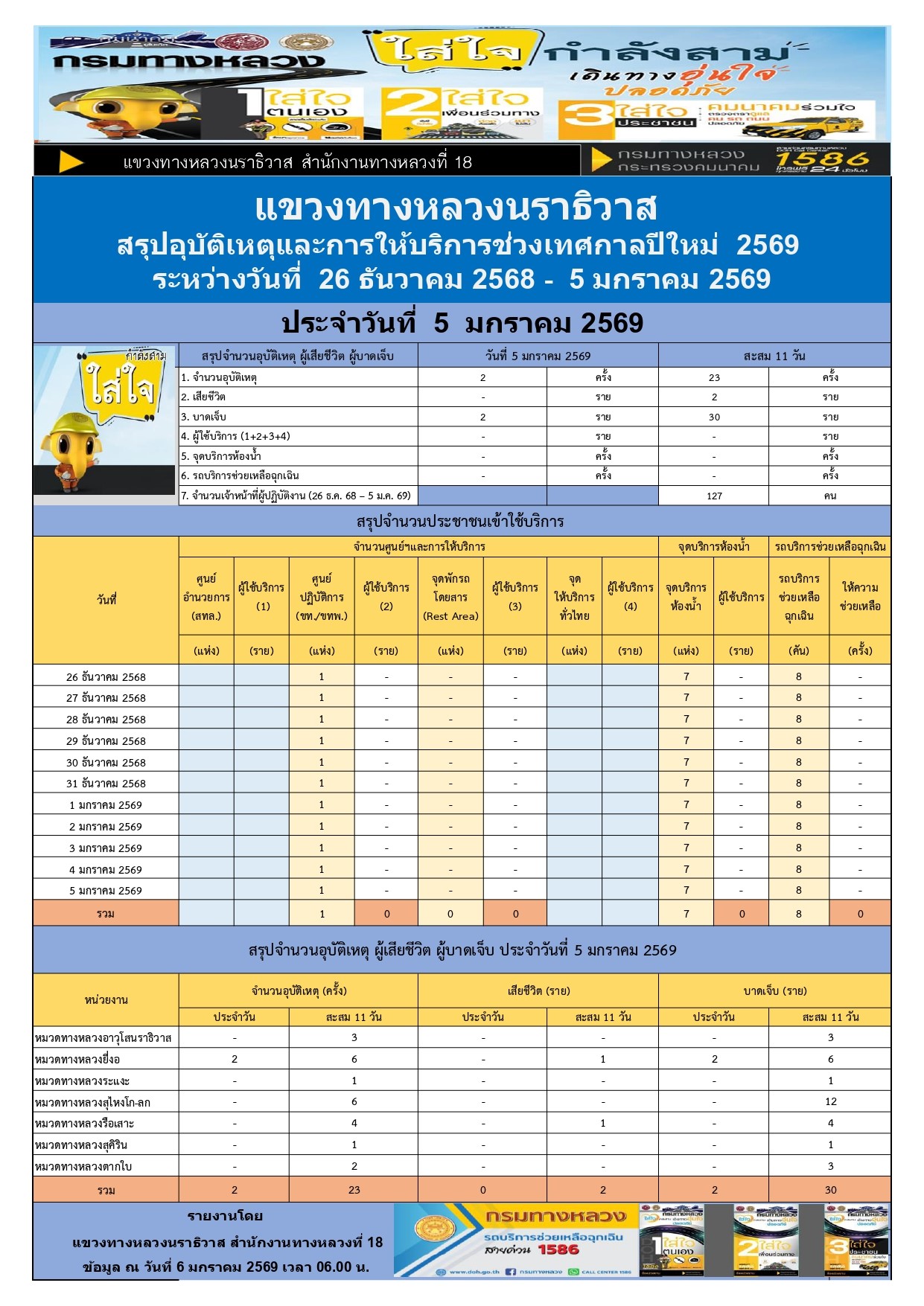 สรุปรายงานอุบัติเหตุและการให้บริการช่วงเทศกาลปีใหม่ 2569 ประจำวันที่ 5 มกราคม 2569