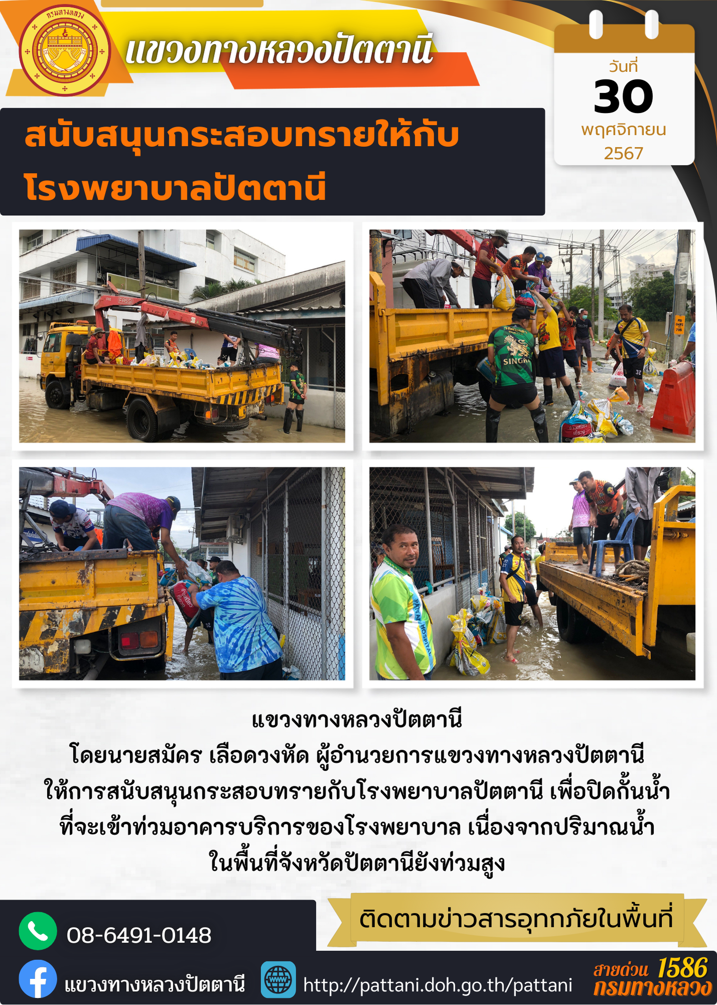 แขวงทางหลวงปัตตานี ให้ความช่วยเหลือผู้ประสบภัยน้ำท่วม