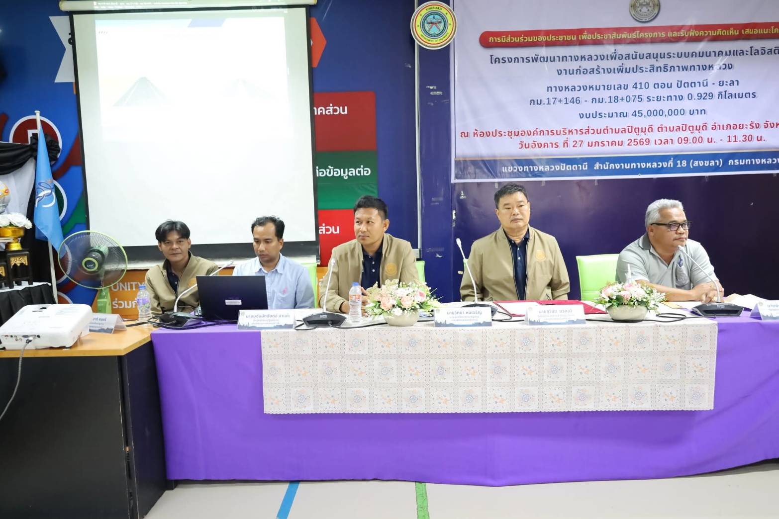 ?? นายสมัคร เลือดวงหัด ผู้อำนวยการแขวงทางหลวงปัตตานี, นายสุวิชัย นวลฉวี รองผู้อำนวยการฯ ฝ่ายปฏิบัติการ, นางอุไรวรรณ มุสิแดง รองผู้อำนวยการฯ ฝ่ายบริหารงานทั่วไป พร้อมด้วย หัวหน้าหมวดทางหลวงยะรัง, หัวหน้างานวางแผน, หัวหน้างานสารสนเทศ, ข้าราชการ และเจ้าหน้าที่ ร่วมดำเนินงานการมีส่วนร่วมของประชาชน ตามระเบียบสำนักนายกรัฐมนตรีว่าด้วยการรับฟังความคิดเห็นของประชาชน พ.ศ. 2548 โครงการก่อสร้างเพิ่มประสิทธิภาพทางหลวง ทางหลวงหมายเลข 410 ตอน ปัตตานี - ยะลา ระหว่าง กม.17+146 - กม.18+075