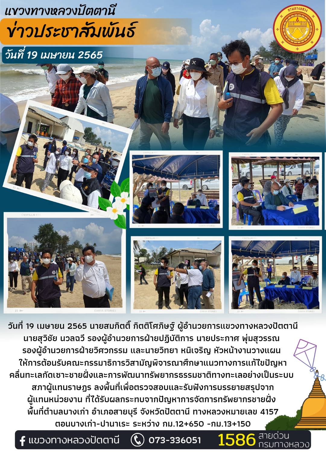 วันที่ 19 เมษายน 2565 นายสมกิตติ์ กิตติโศภิษฐ์ ผู้อำนวยการแขวงทางหลวงปัตตานี นายสุวิชัย นวลฉวี รองผู้อำนวยการฝ่ายปฏิบัติการ นายประกาศ พุ่มสุวรรณ
