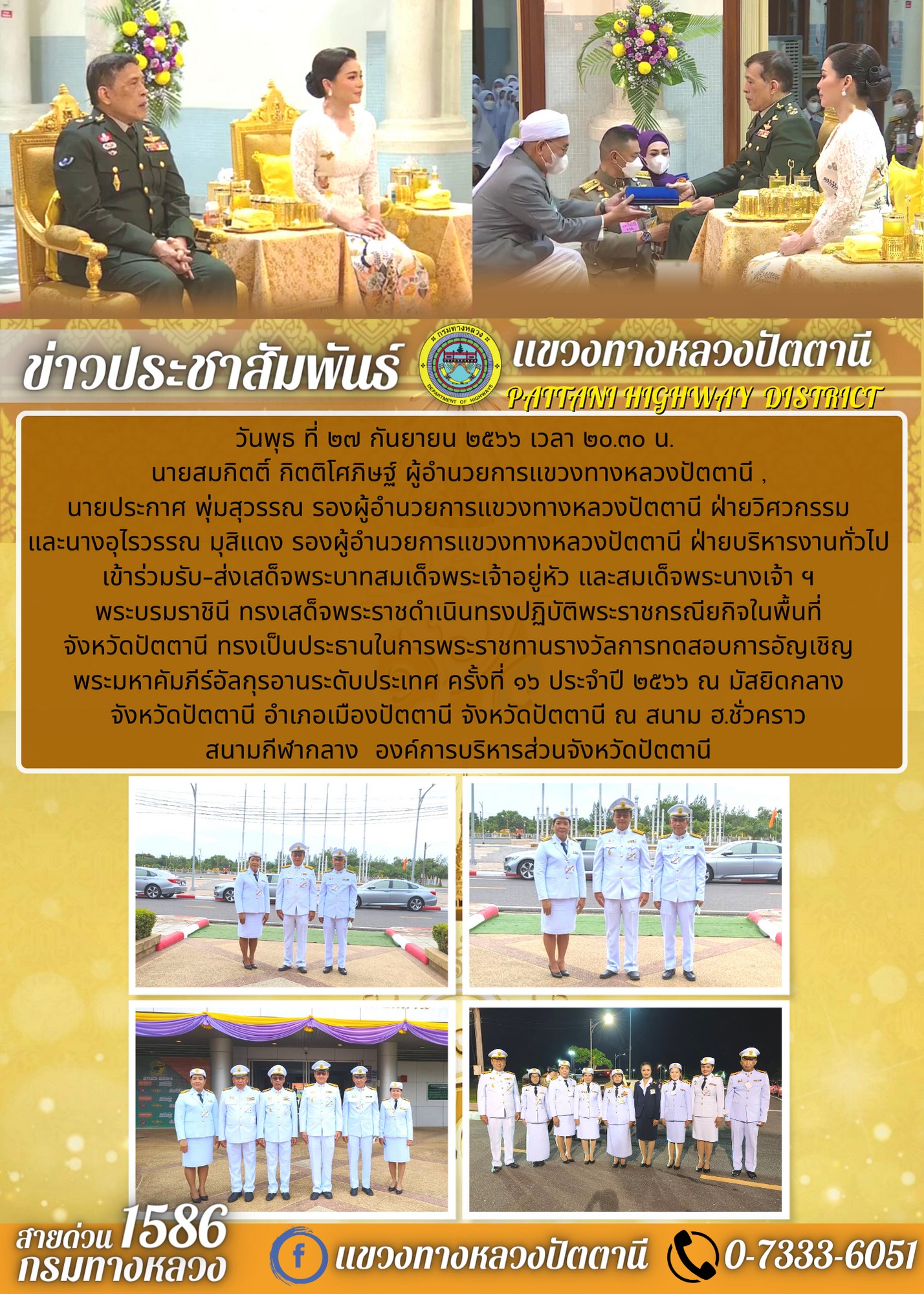 วันพุธ ที่ ๒๗ กันยายน ๒๕๖๖ เวลา ๒๐.๓๐ น. นายสมกิตติ์ กิตติโศภิษฐ์ ผู้อำนวยการแขวงทางหลวงปัตตานี พร้อมด้วยนายประกาศ พุ่มสุวรรณ รองผู้อำนวยการแขวงทางหลวงปัตตานี ฝ่ายวิศวกรรม และนางอุไรวรรณ มุสิแดง รองผู้อำนวยการแขวงทางหลวงปัตตานี ฝ่ายบริหาร เข้าร่วมส่งเสด็จพระบาทสมเด็จพระเจ้าอยู่หัว และสมเด็จพระนางเจ้า ฯ พระบรมราชินี ทรงเสด็จพระราชดำเนินทรงปฏิบัติพระราชกรณียกิจในพื้นที่จังหวัดปัตตานี ทรงเป็นประธานในการพระราชทานรางวัลการทดสอบการอัญเชิญพระมหาคัมภีร์อัลกุรอานระดับประเทศ ครั้งที่ ๑๖ ประจำปี ๒๕๖๖ ณ มัสยิดกลางจังหวัดปัตตานี อำเภอเมืองปัตตานี จังหวัดปัตตานี ณ สนาม ฮ.ชั่วคราว สนามกีฬากลาง องค์การบริหารส่วนจังหวัดปัตตานี