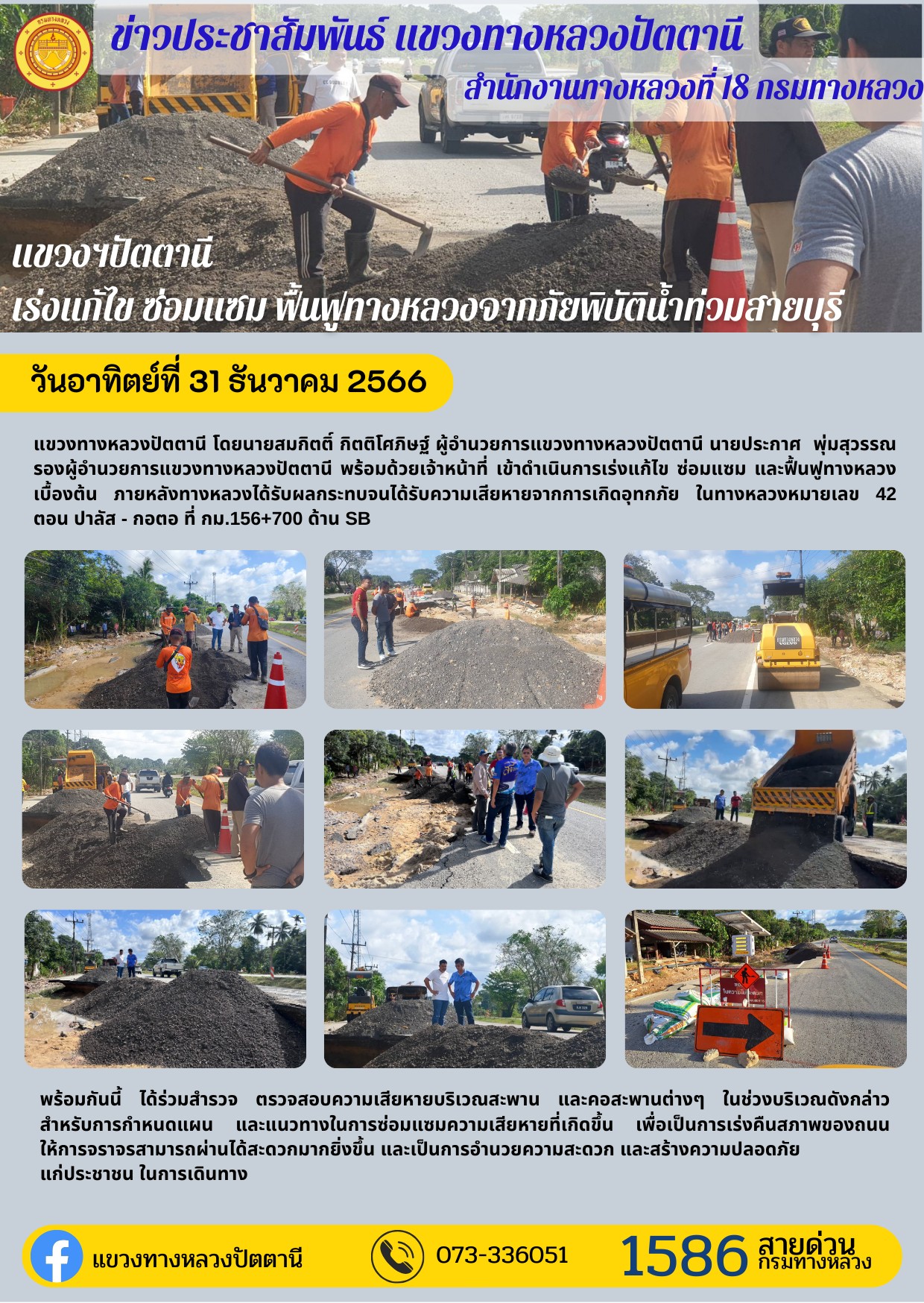 วันอาทิตย์ที่ 31 ธันวาคม 25666 แขวงทางหลวงปัตตานี โดยนายสมกิตติ์ กิตติโศภิษฐ์ ผู้อำนวยการแขวงทางหลวงปัตตานี นายประกาศ พุ่มสุวรรณ รองผู้อำนวยการแขวงทางหลวงปัตตานี พร้อมด้วยเจ้าหน้าที่ เข้าดำเนินการเร่งแก้ไข ซ่อมแซม และฟื้นฟูทางหลวงเบื้องต้น ภายหลังทางหลวงได้รับผลกระทบจนได้รับความเสียหายจากการเกิดอุทกภัย ในทางหลวงหมายเลข 42 ตอน ปาลัส - กอตอ ที่ กม.156+700 ด้าน SB