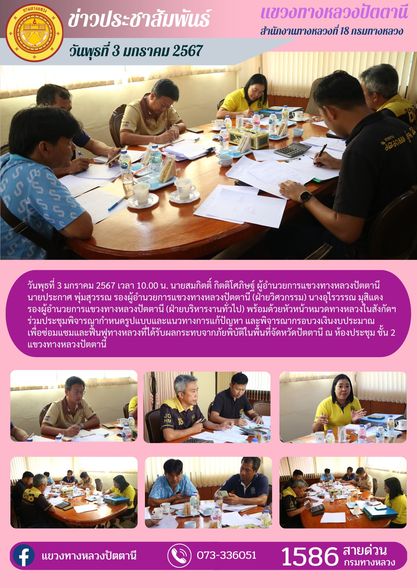 วันพุธที่ 3 มกราคม 2567 เวลา 10.00 น. นายสมกิตติ์ กิตติโศภิษฐ์ ผู้อำนวยการแขวงทางหลวงปัตตานี นายประกาศ พุ่มสุวรรณ รองผู้อำนวยการแขวงทางหลวงปัตตานี (ฝ่ายวิศวกรรม) นางอุไรวรรณ มุสิแดง รองผู้อำนวยการแขวงทางหลวงปัตตานี (ฝ่ายบริหารงานทั่วไป) พร้อมด้วยหัวหน้าหมวดทางหลวงในสังกัดฯ ร่วมประชุมพิจารณากำหนดรูปแบบและแนวทางการแก้ปัญหา และพิจารณากรอบวงเงินงบประมาณ เพื่อซ่อมแซมและฟื้นฟูทางหลวงที่ได้รับผลกระทบจากภัยพิบัติในพื้นที่จัดหวัดปัตตานี ณ ห้องประชุม ชั้น 2 แขวงทางหลวงปัตตานี
