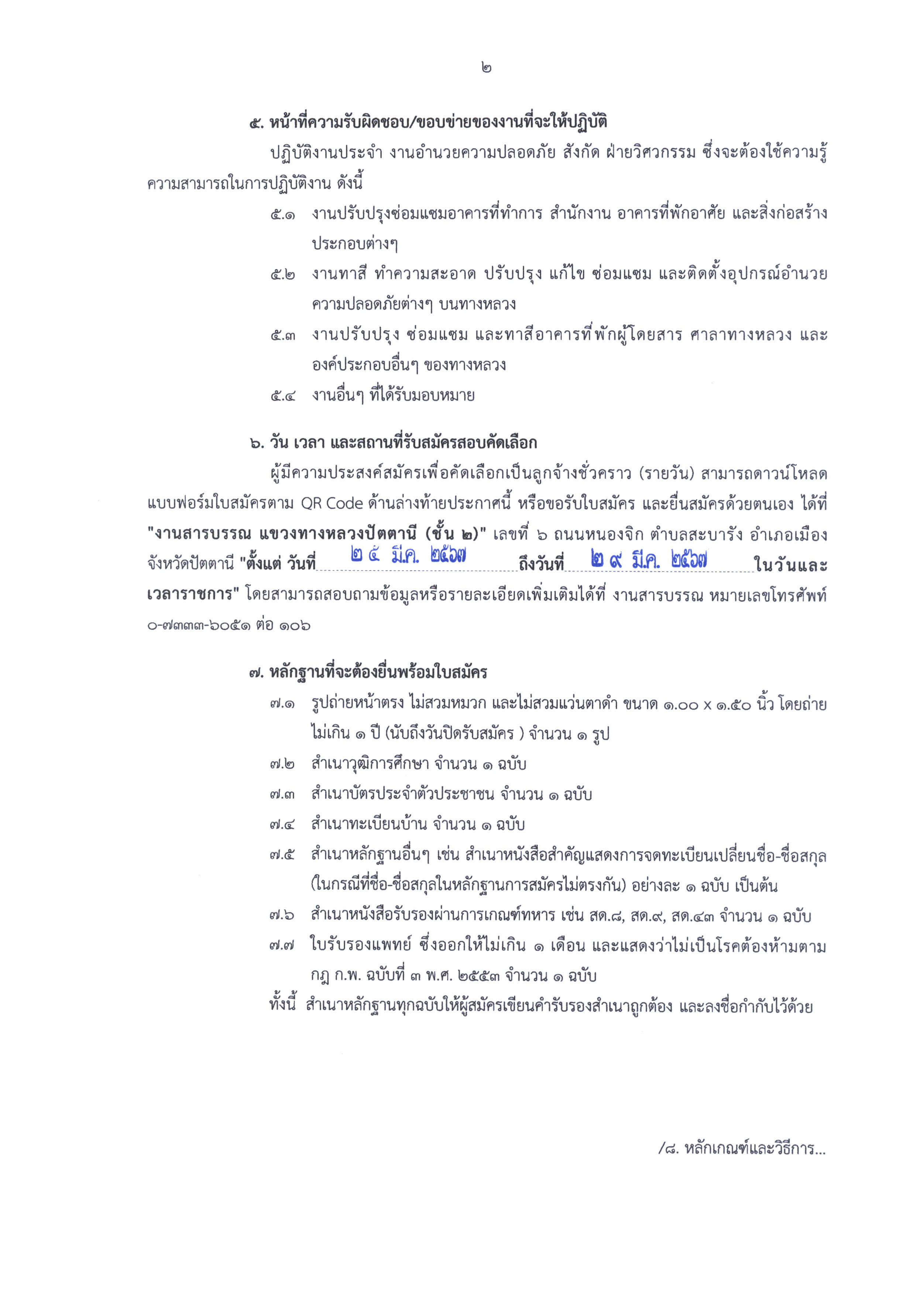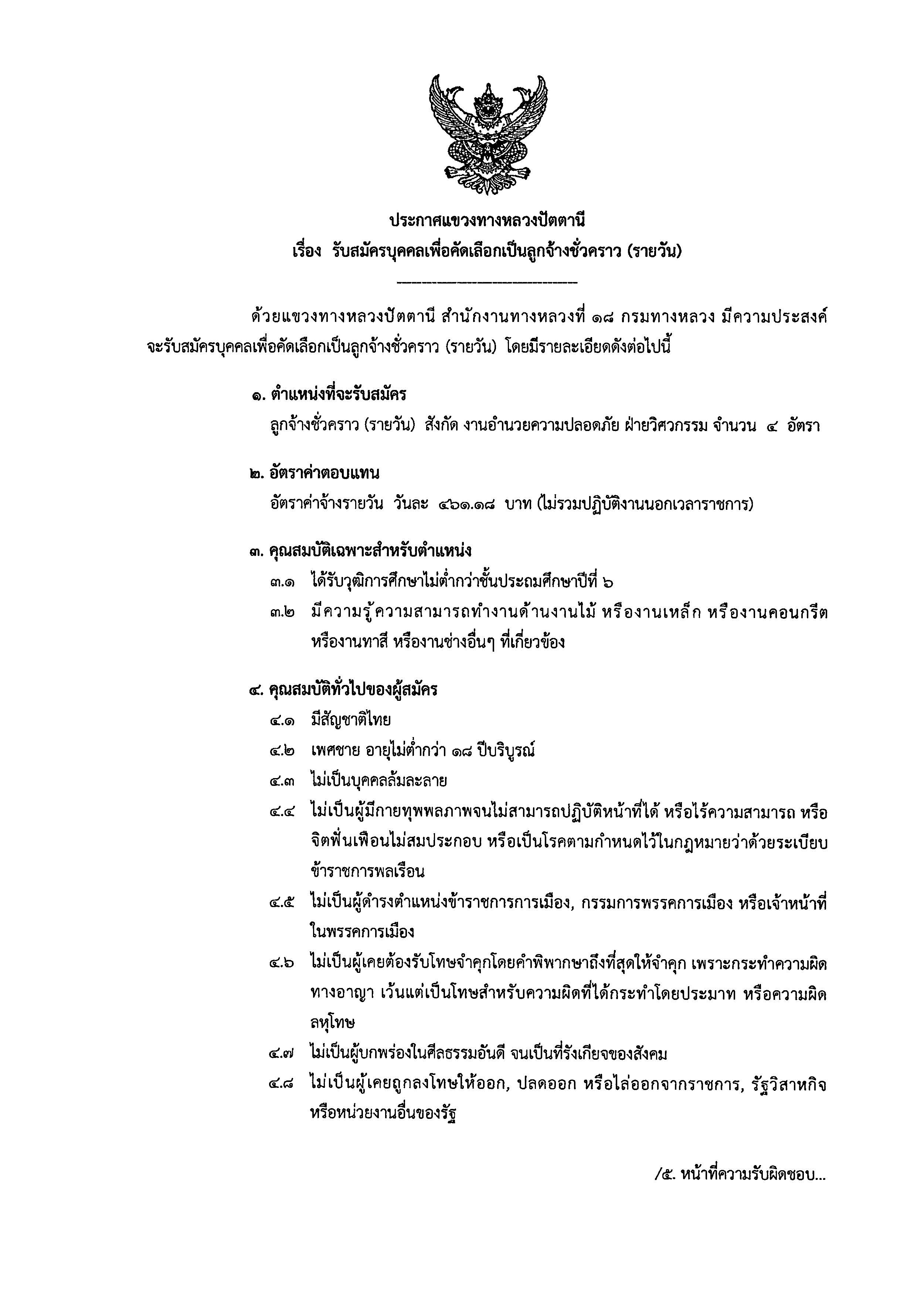 ประกาศรับสมัครบุคคลเพื่อคัดเลือกเป็นลูกจ้างชั่วคราว (รายวัน) ตำเเหน่ง คนงาน สังกัด งานอำนวยความปลอดภัย เเขวงทางหลวงปัตตานี กรมทางหลวง