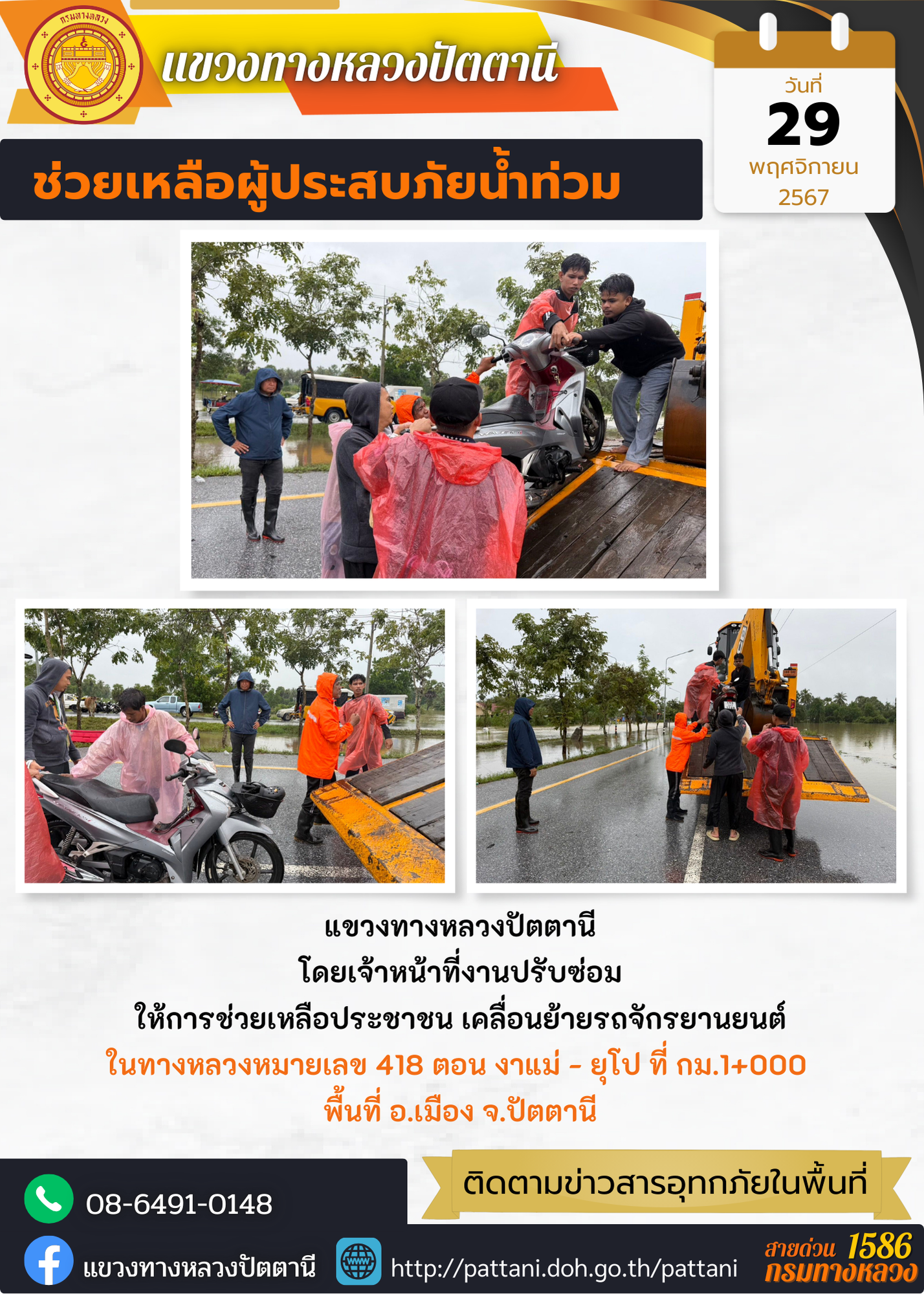แขวงทางหลวงปัตตานี โดยเจ้าหน้าที่งานปรับซ่อม ให้การช่วยเหลือประชาชน เคลื่อนย้ายรถจักรยานยนต์ ในทางหลวงหมายเลข 418 ตอน งาแม่ - ยุโป ที่ กม.1+000 พื้นที่ อ.เมือง จ.ปัตตานี