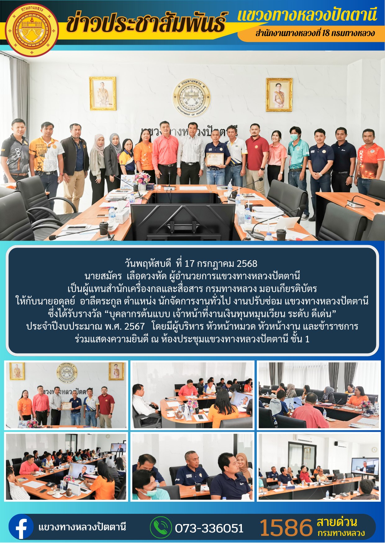 นายสมัคร เลือดวงหัด ผู้อำนวยการแขวงทางหลวงปัตตานี เป็นผู้แทนสำนักเครื่องกลและสื่อสาร กรมทางหลวง มอบเกียรติบัตร ให้กับนายอดุลย์ อาลีตระกูล ตำแหน่ง นักจัดการงานทั่วไป งานปรับซ่อม แขวงทางหลวงปัตตานี ซึ่งได้รับรางวัล “บุคลากรต้นแบบ เจ้าหน้าที่งานเงินทุนหมุนเวียน ระดับ ดีเด่น” ประจำปีงบประมาณ พ.ศ. 2567 โดยมีผู้บริหาร หัวหน้าหมวด หัวหน้างาน และข้าราชการ ร่วมแสดงความยินดี ณ ห้องประชุมแขวงทางหลวงปัตตานี ชั้น 1