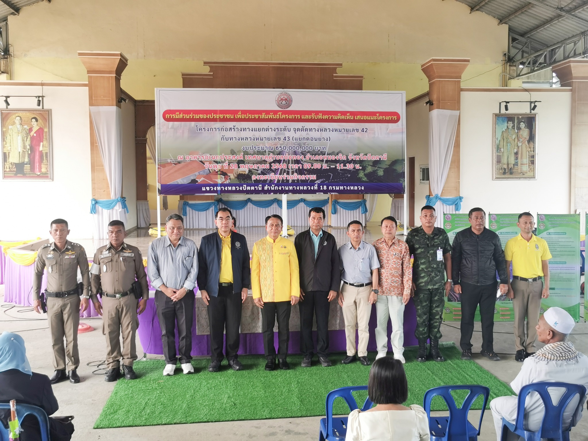 จุดตัดทางหลวงหมายเลข 42 กับทางหลวงหมายเลข 43 (แยกดอนยาง) ในการนี้ นายเชษฐพงศ์ บางอวด นายช่างโยธาอาวุโส, นายทวีศักดิ์ ชาญวรรณกุล วิศวกรโยธาชำนาญการพิเศษ, นายโอสธี เรืองสว่าง วิศวกรงานทาง, นายคุณวุฒิ สุนทรนนท์ วิศวกรโยธาชำนาญการพิเศษ ร่วมเป็นวิทยากร บรรยายรูปแบบและรายละเอียดการก่อสร้างโครงการฯ, รับฟังความคิดเห็นและข้อเสนอแนะ และร่วมชี้แจงข้อซักถามด้วย โดยมี นายไชยพร นิยมแก้ว รองผู้ว่าราชการจังหวัดปัตตานี เป็นประธานในพิธีเปิด ณ อาคารอเนกประสงค์ เทศบาลตำบลบ่อทอง อำเภอหนองจิก จังหวัดปัตตานี
