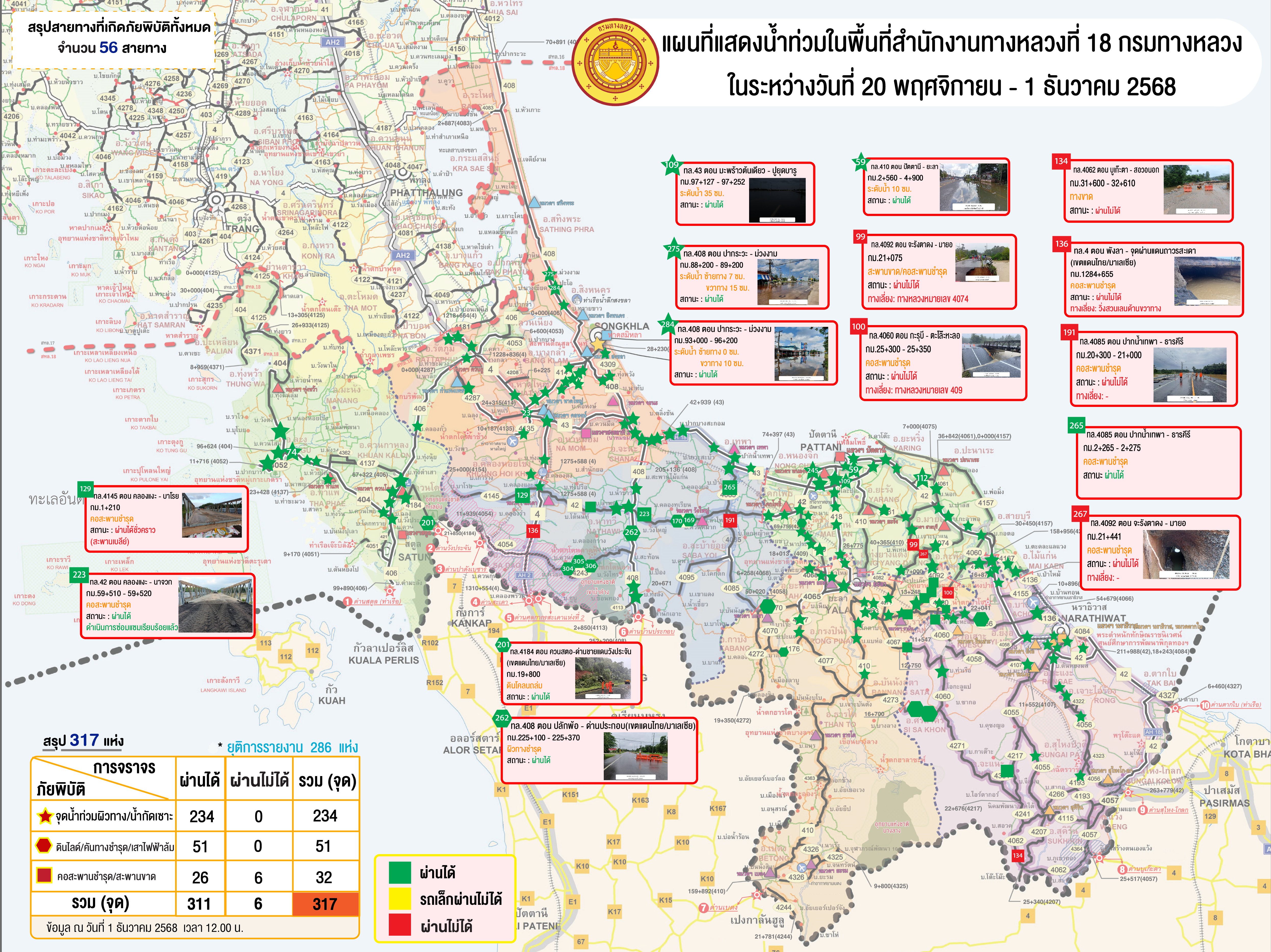 สทล.18 ขอรายงานน้ำท่วมในระหว่างวันที่ 20 พ.ย. - 1 ธ.ค. 68 ประจำวันที่ 1 ธ.ค. 68 ณ เวลา 12.00 น.
