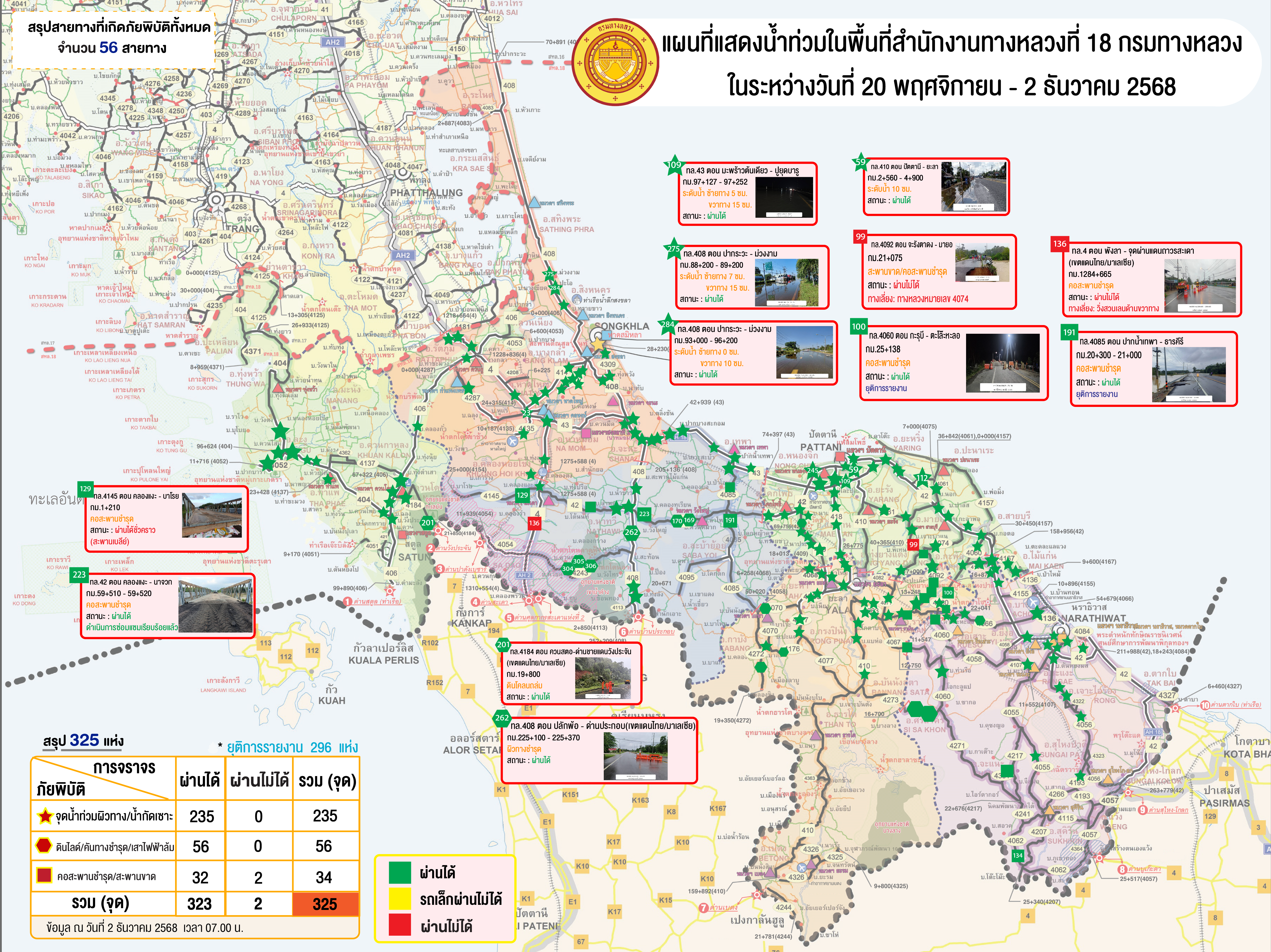 สำนักงานทางหลวงที่18 ขอรายงานน้ำท่วมในระหว่างวันที่ 20 พ.ย. - 2 ธ.ค. 68 ประจำวันที่ 2 ธ.ค. 68 ณ เวลา 07.00 น.
