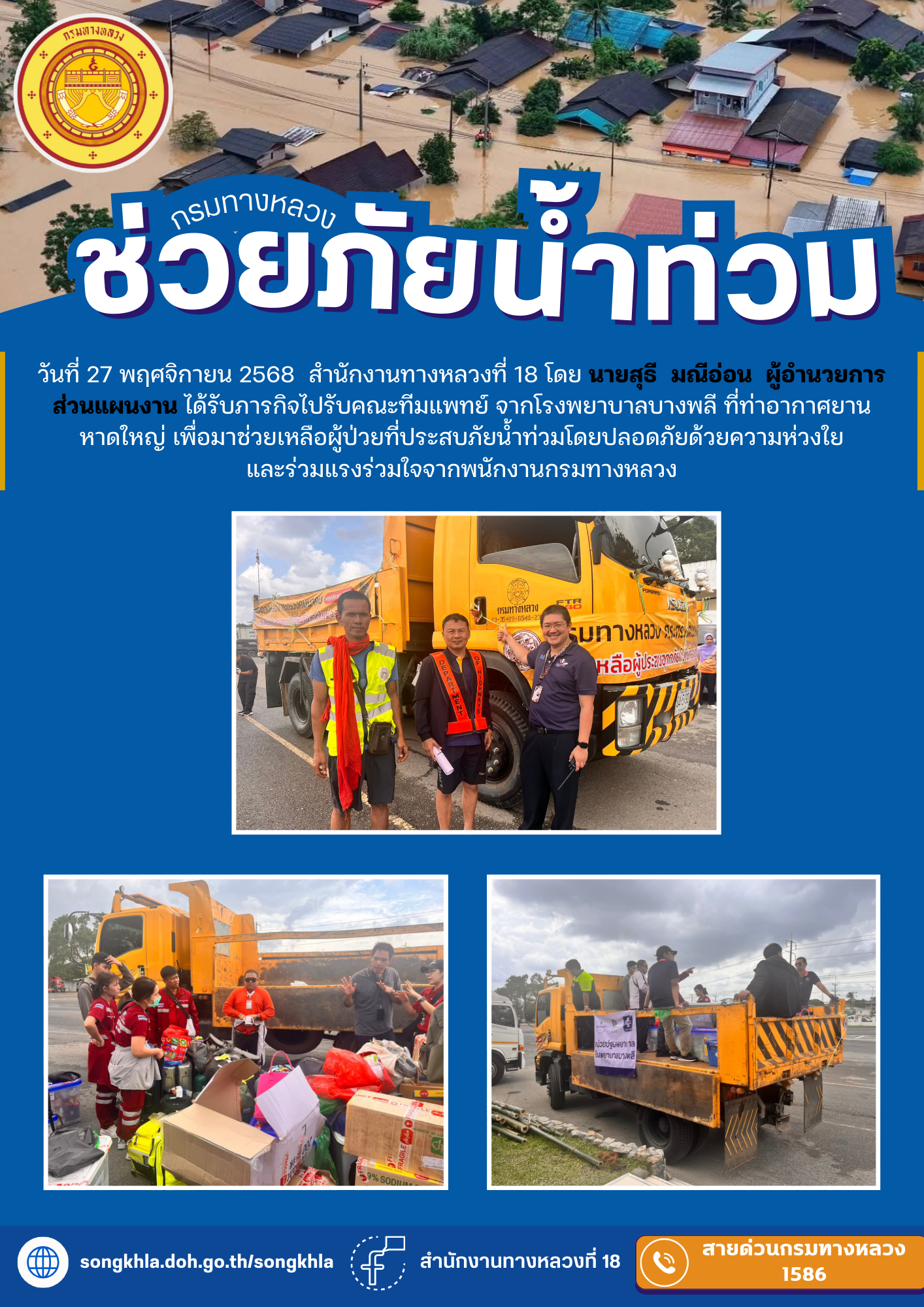 กรมทางหลวง โดยเจ้าหน้าที่ฯ ได้รับภารกิจไปรับถุงยังชีพที่ค่าย มทบ. ไปยังที่ทำการปกครองอำเภอบางกล่ำ จังหวัดสงขลา