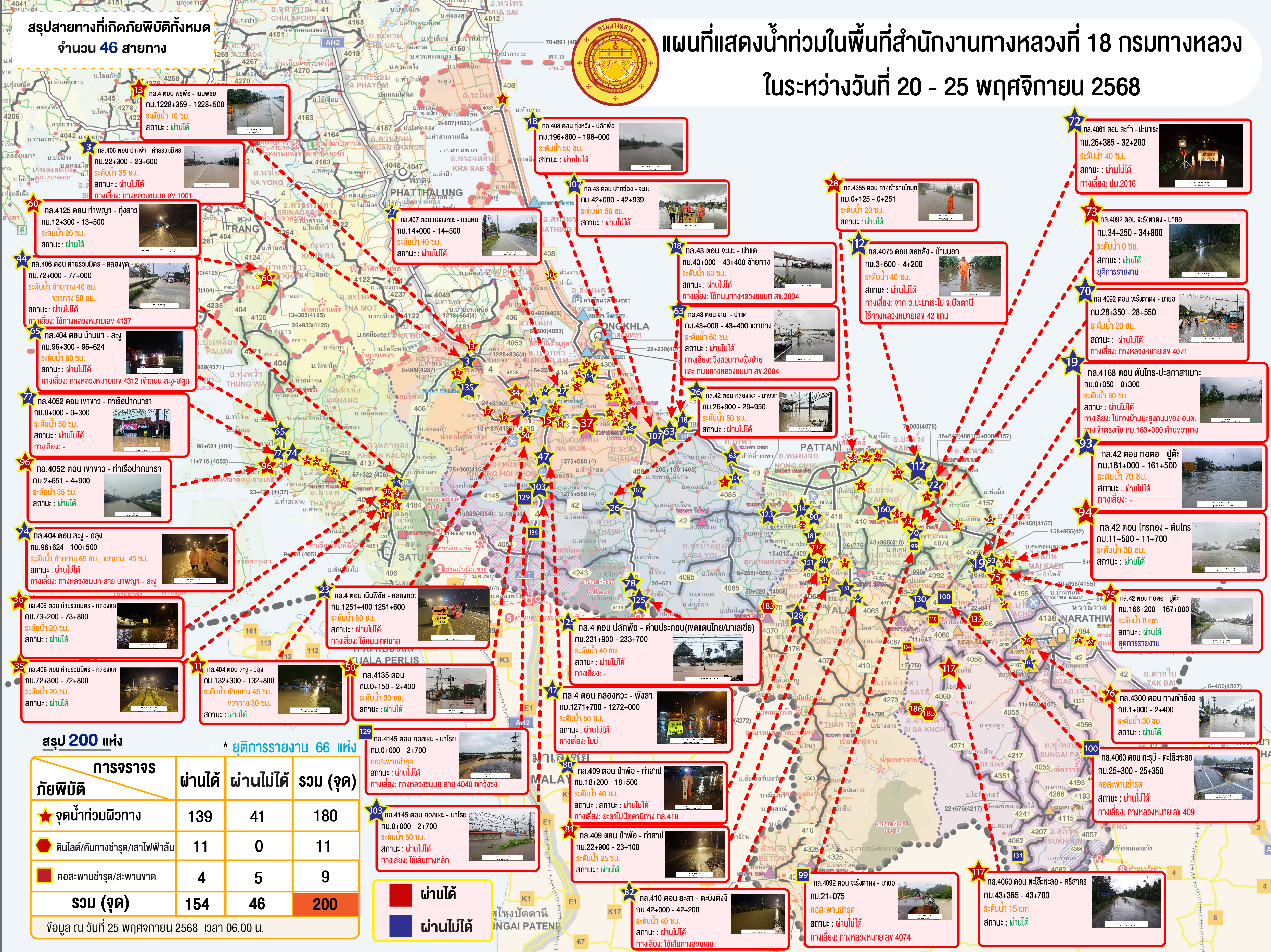 สำนักงานทางหลวงที่18 ขอรายงานน้ำท่วมในระหว่างวันที่ 20-25 พ.ย. 68 ประจำวันที่ 25 พ.ย. 68 ณ เวลา 06.00 น.
