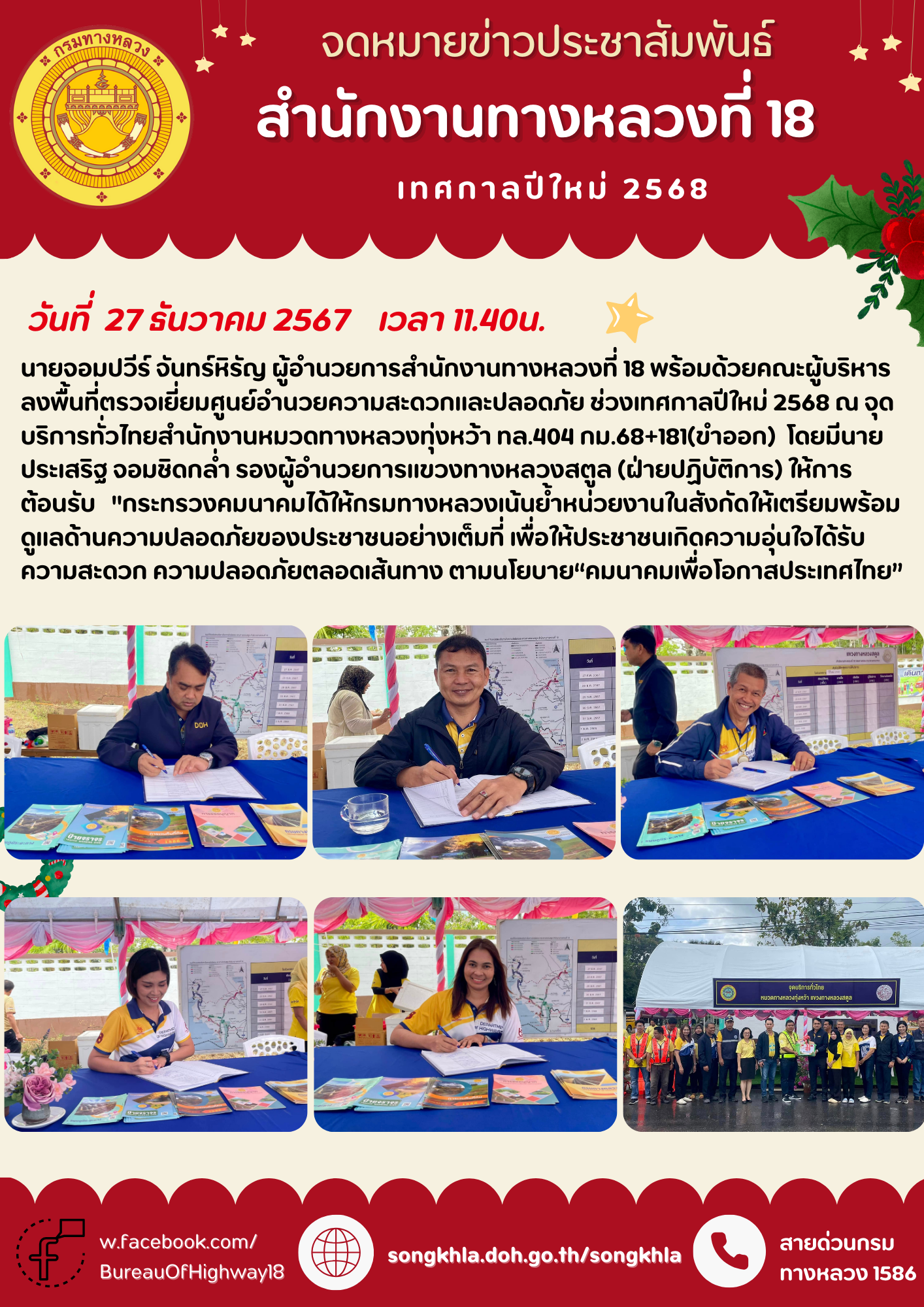 สำนักงานทางหลวงที่ 18” เตรียมพร้อมอำนวยความสะดวก-ปลอดภัยประชาชน รองรับการเดินทางช่วงเทศกาลปีใหม่ 2568 ตลอด 24 ชม.