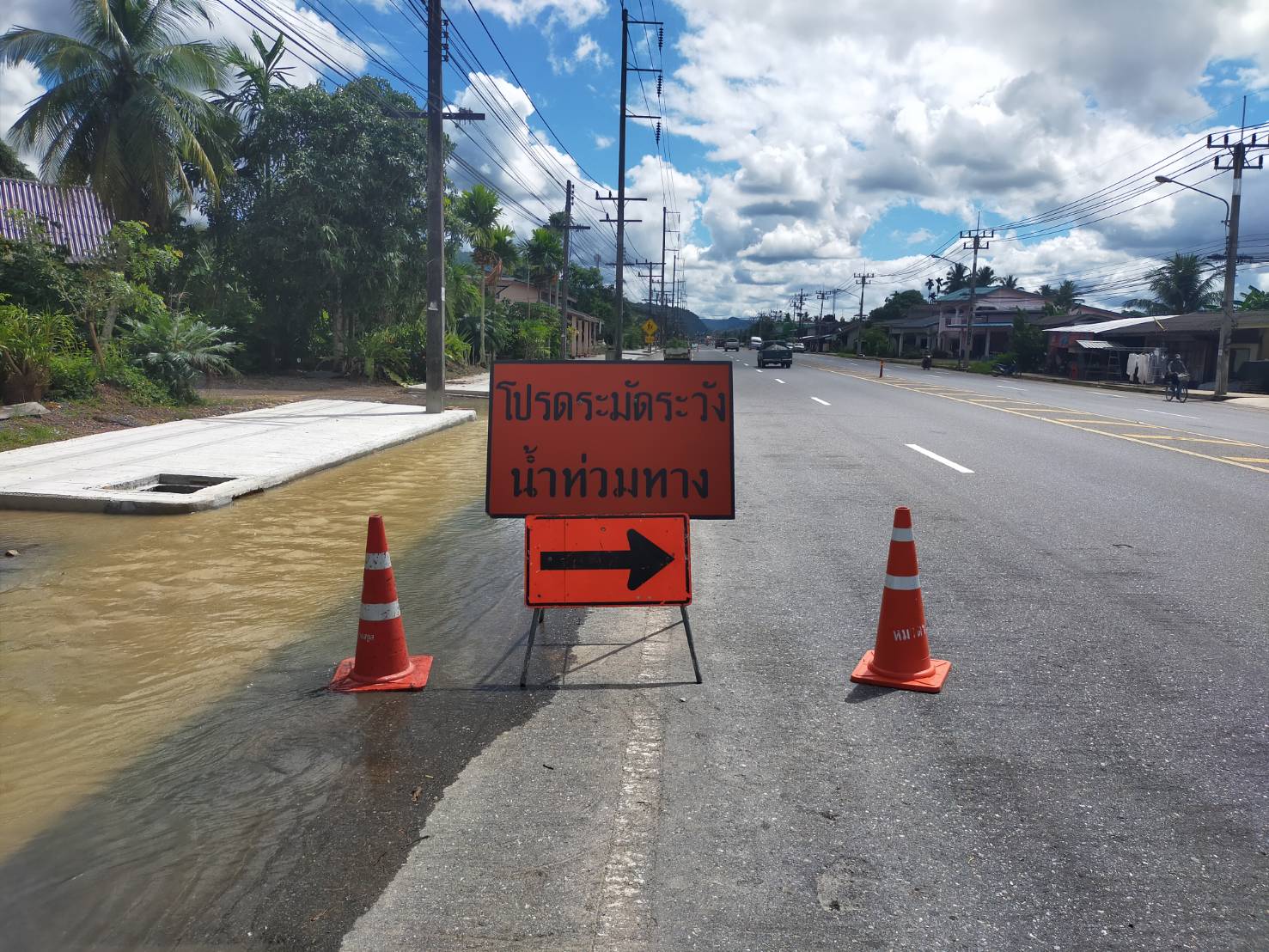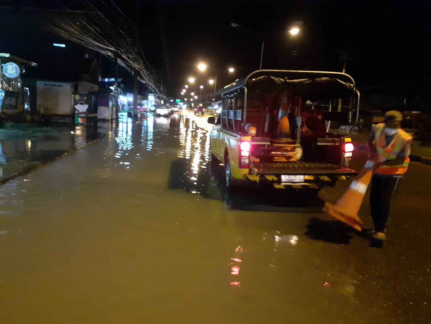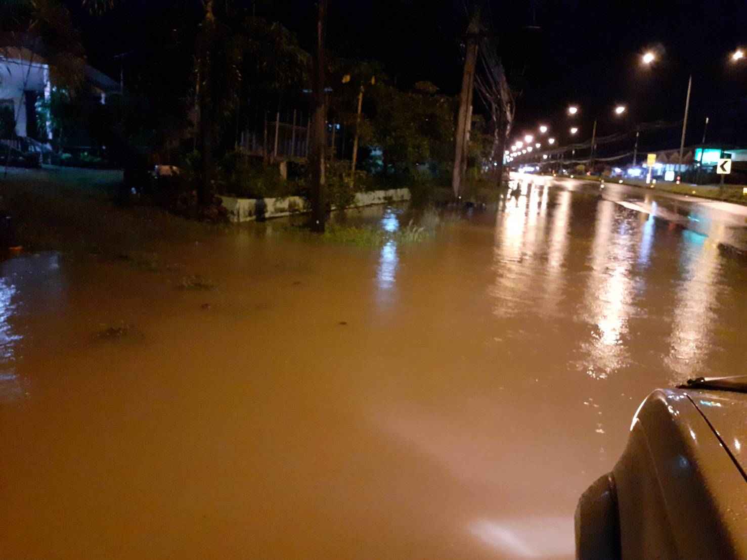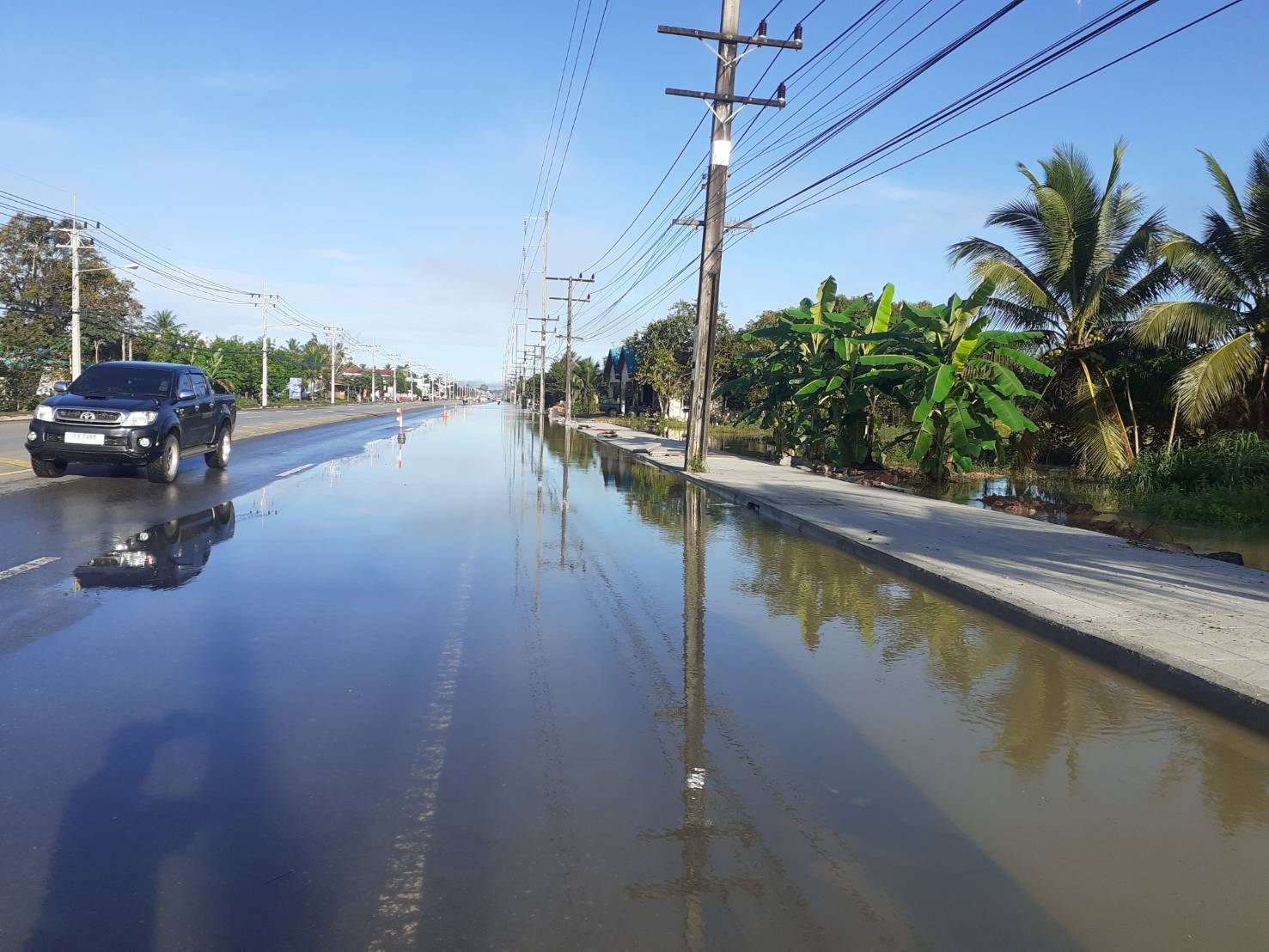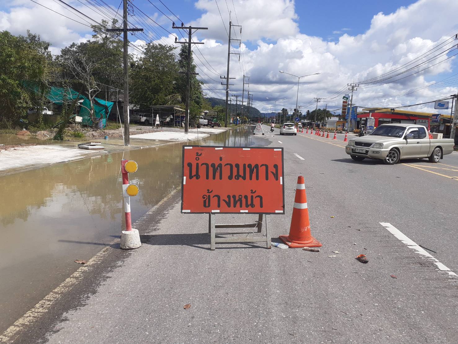 เนื่องจากฝนตกต่อเนื่อง ทำให้น้ำเออล้น ท่วมผิวจราจร ระดับน้ำด้านขวาและด้านซ้ายท่วมสูง 15-20. ซม.  ข้างละ 1. ช่องจราจร