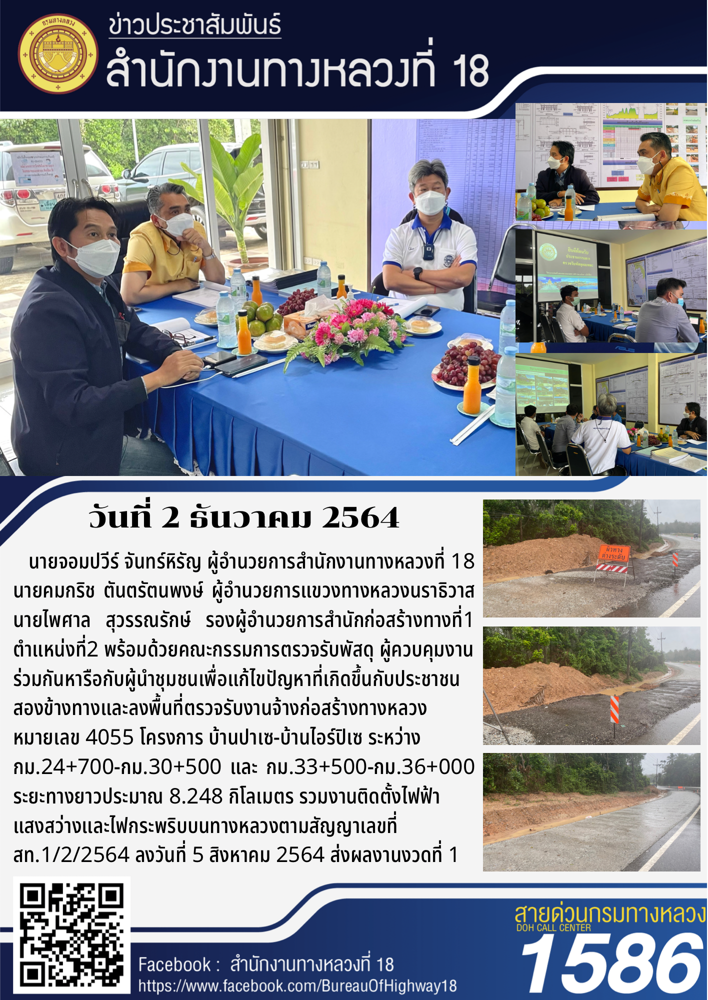 วันนี้ (2 ธันวาคม 2564) นายจอมปวีร์ จันทร์หิรัญ ผู้อำนวยการสำนักงานทางหลวงที่ 18 นายคมกริช ตันตรัตนพงษ์ ผู้อำนวยการแขวงทางหลวงนราธิวาส นายไพศาล สุวรรณรักษ์ รองผู้อำนวยการสำนักก่อสร้างทางที่ 1 ตำแหน่งที่ 2 พร้อมด้วยคณะกรรมการตรวจรับพัสดุ ผู้ควบคุมงาน ร่วมกันหารือกับผู้นำชุมชนเพื่อแก้ไขปัญหาที่เกิดขึ้นกับประชาชนสองข้างทาง และลงพื้นที่ตรวจรับงานจ้างก่อสร้างทางหลวงหมายเลข 4055 โครงการ บ้านปาเซ-บ้านไอร์ปิเซ ระหว่าง กม.24+700 - กม.30+500 และ กม.33+500 - กม.36+000 ระยะทางยาวประมาณ 8.248 กิโลเมตร รวมงานติดตั้งไฟฟ้าแสงสว่างและไฟกระพริบบนทางหลวง ตามสัญญาเลขที่ สท.1/2/2564 ลงวันที่ 5 สิงหาคม 2564 ส่งผลงานงวดที่ 1