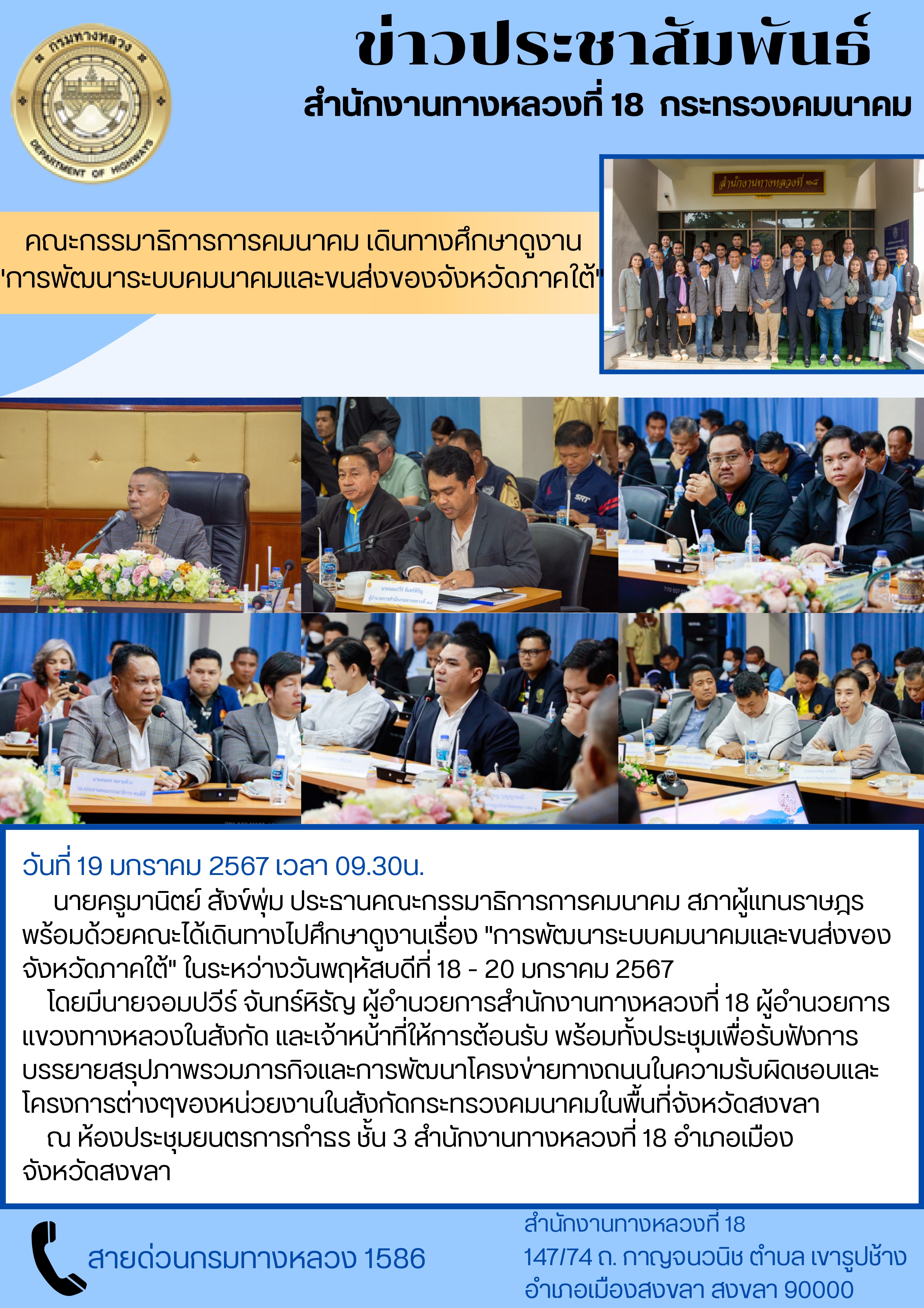 วันที่ 19 มกราคม 2567 เวลา 09.30น. นายครูมานิตย์ สังข์พุ่ม ประธานคณะกรรมาธิการการคมนาคม สภาผู้แทนราษฎร พร้อมด้วยคณะได้เดินทางไปศึกษาดูงานเรื่อง "การพัฒนาระบบคมนาคมและขนส่งของจังหวัดภาคใต้" ในระหว่างวันพฤหัสบดีที่ 18 - 20 มกราคม 2567 โดยมีนายจอมปวีร์ จันทร์หิรัญ ผู้อำนวยการสำนักงานทางหลวงที่ 18 ผู้อำนวยการแขวงทางหลวงในสังกัด และเจ้าหน้าที่ ให้การต้อนรับ