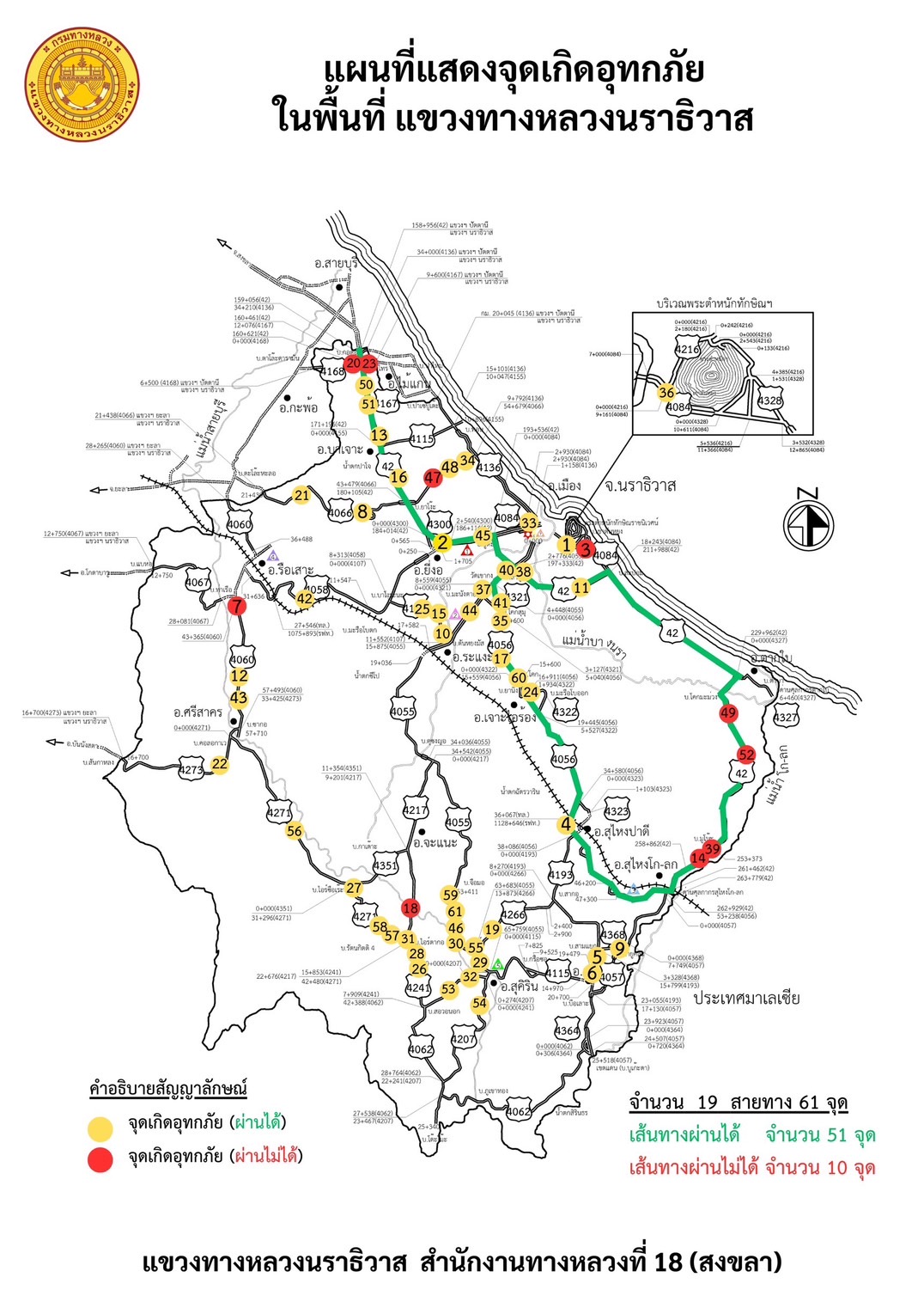 แผนที่แสดงจุดเกิดอุทกภัยในพื้นที่แขวงทางหลวงนราธิวาส