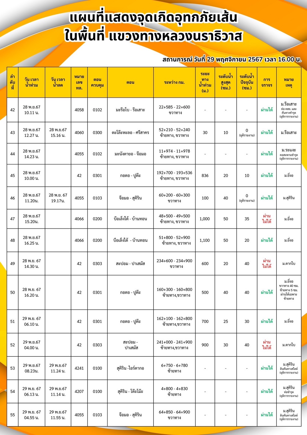 ข้อมูลข่าว : แผนที่แสดงจุดเกิดอุทกภัยในพื้นที่แขวงทางหลวงนราธิวาส ข้อมูล ณ วันที่ 26-29 พฤศจิกายน 2567 เวลา 16.00 น.